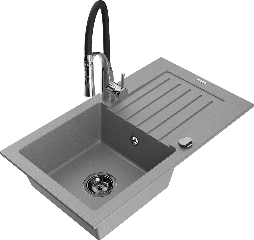 Technické dáta: drez: Rozmer: 752 x 436 x 161 mm Hĺbka komory: 151 mm Rozmery komory: 356x332 mm Priemer odtoku: ø90 mm Typ: 1-miska s odkvapkávačom Typ: Zapustené do pracovnej dosky Šedá farba Povrchová úprava sifónu: čierna Materiál: žula (80% žulové kamenivo, 20% živice) Prepadový otvor: Áno Otvory: (batérie, automatické) 2 Inštalácia: Univerzálna, je možné inštalovať s odkvapkávačom na ľavú alebo pravú stranu Vysoká odolnosť proti poškriabaniu a zmene farby Odolnosť proti tepelným šokom Ľahko čistiteľný povrch Dva dodatočné vyfrézované otvory na samodierovanie ø35 kuchynská batéria: Materiál: mosadz Farba: chróm/čierna Hlava: Keramická Prevzdušňovač: Áno Typ: Jedna páka Výška batérie: 430 mm Rozsah výtoku: 185 mm Batéria má výsuvný výtok(GT) Ean: 5905315045591