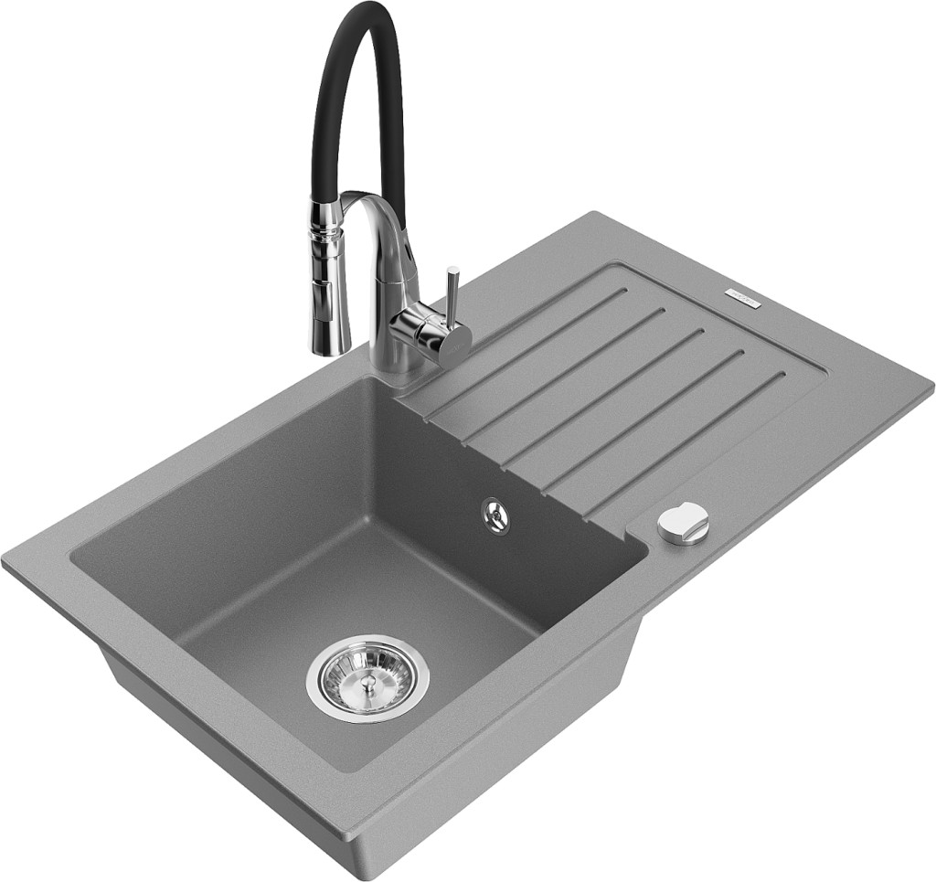Technické dáta: drez: Rozmer: 752 x 436 x 161 mm Hĺbka komory: 151 mm Rozmery komory: 356x332 mm Priemer odtoku: ø90 mm Typ: 1-miska s odkvapkávačom Typ: Zapustené do pracovnej dosky Šedá farba Povrchová úprava sifónu: Chrome Materiál: žula (80% žulové kamenivo, 20% živice) Prepadový otvor: Áno Otvory: (batérie, automatické) 2 Inštalácia: Univerzálna, je možné inštalovať s odkvapkávačom na ľavú alebo pravú stranu Vysoká odolnosť proti poškriabaniu a zmene farby Odolnosť proti tepelným šokom Ľahko čistiteľný povrch Dva dodatočné vyfrézované otvory na samodierovanie ø35 kuchynská batéria: Materiál: mosadz Farba: chróm/čierna Hlava: Keramická Prevzdušňovač: Áno Typ: Jedna páka Výška batérie: 430 mm Rozsah výtoku: 185 mm Batéria má výsuvný výtok(GT) Ean: 5905315045584