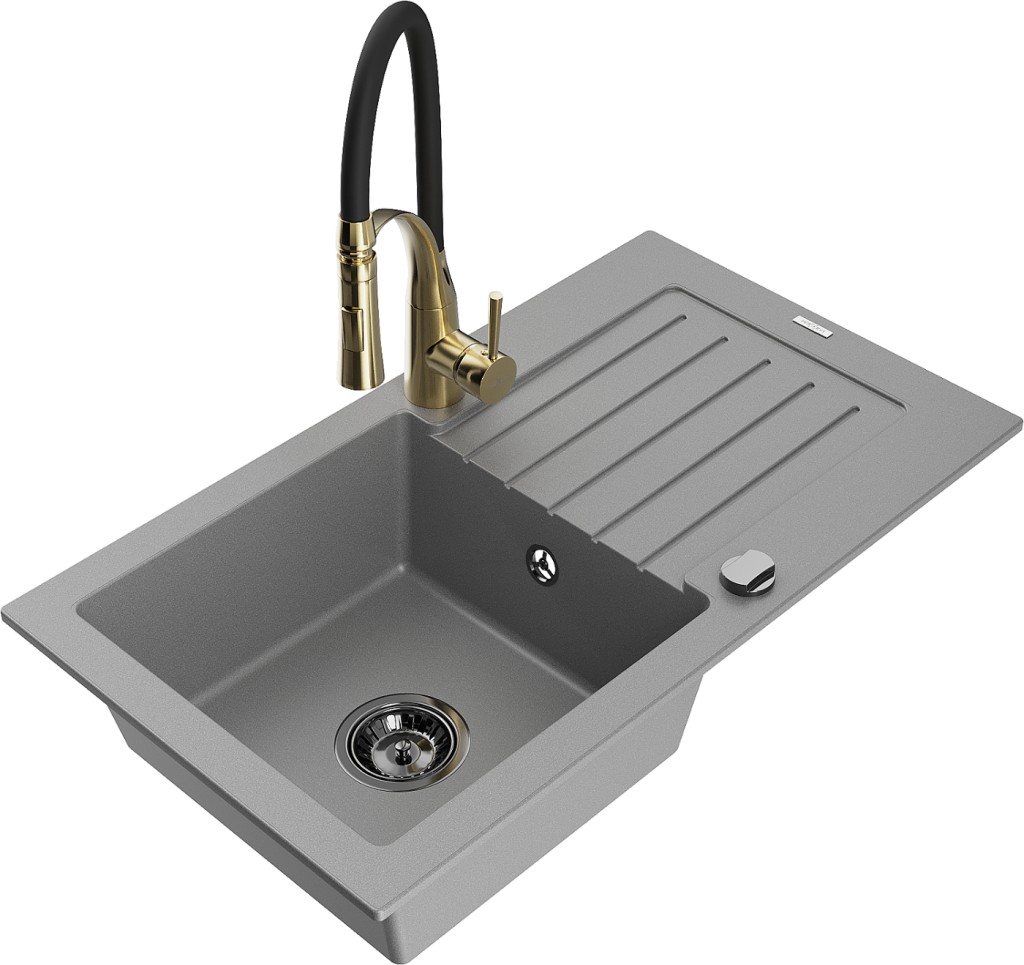 Technické dáta: drez: Rozmer: 752 x 436 x 161 mm Hĺbka komory: 151 mm Rozmery komory: 356x332 mm Priemer odtoku: ø90 mm Typ: 1-miska s odkvapkávačom Typ: Zapustené do pracovnej dosky Šedá farba Povrchová úprava sifónu: čierna Materiál: žula (80% žulové kamenivo, 20% živice) Prepadový otvor: Áno Otvory: (batérie, automatické) 2 Inštalácia: Univerzálna, je možné inštalovať s odkvapkávačom na ľavú alebo pravú stranu Vysoká odolnosť proti poškriabaniu a zmene farby Odolnosť proti tepelným šokom Ľahko čistiteľný povrch Dva dodatočné vyfrézované otvory na samodierovanie ø35 kuchynská batéria: Materiál: mosadz Farba: Zlatá/Čierna Hlava: Keramická Prevzdušňovač: Áno Typ: Jedna páka Výška batérie: 430 mm Rozsah výtoku: 185 mm Batéria má výsuvný výtok(GT) Ean: 5905315045614