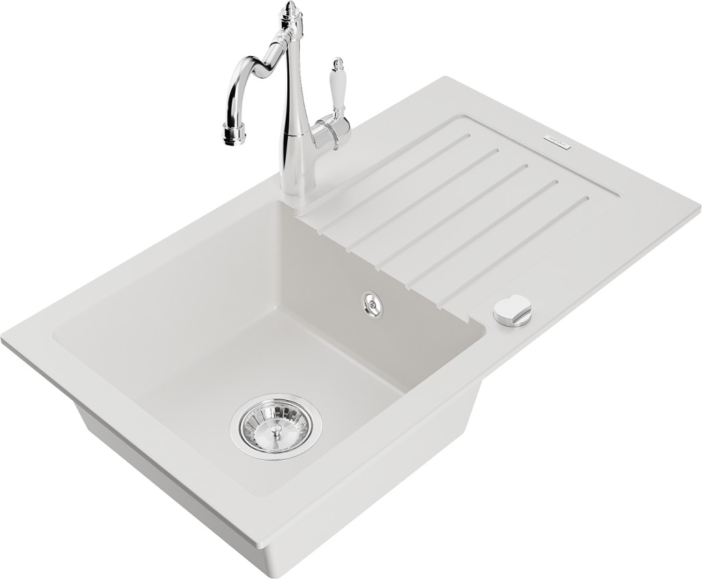 Technické dáta: drez: Rozmer: 752 x 436 x 161 mm Hĺbka komory: 151 mm Rozmery komory: 356x332 mm Priemer odtoku: ø90 mm Typ: 1-miska s odkvapkávačom Typ: Zapustené do pracovnej dosky biela farba Povrchová úprava sifónu: Chrome Materiál: žula (80% žulové kamenivo, 20% živice) Prepadový otvor: Áno Otvory: (batérie, automatické) 2 Inštalácia: Univerzálna, je možné inštalovať s odkvapkávačom na ľavú alebo pravú stranu Vysoká odolnosť proti poškriabaniu a zmene farby Odolnosť proti tepelným šokom Ľahko čistiteľný povrch Dva dodatočné vyfrézované otvory na samodierovanie ø35 kuchynská batéria: Materiál: mosadz Farba: Chrome Hlava: Keramická Prevzdušňovač: Áno Typ: Jedna páka Výška batérie: 290 mm Rozsah výtoku: 260 mm(GT) Ean: 5905315039620
