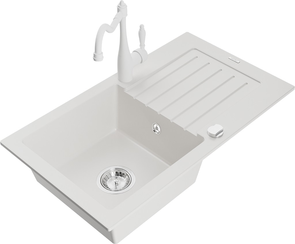 Technické dáta: drez: Rozmer: 752 x 436 x 161 mm Hĺbka komory: 151 mm Rozmery komory: 356x332 mm Priemer odtoku: ø90 mm Typ: 1-miska s odkvapkávačom Typ: Zapustené do pracovnej dosky biela farba Povrchová úprava sifónu: Chrome Materiál: žula (80% žulové kamenivo, 20% živice) Prepadový otvor: Áno Otvory: (batérie, automatické) 2 Inštalácia: Univerzálna, je možné inštalovať s odkvapkávačom na ľavú alebo pravú stranu Vysoká odolnosť proti poškriabaniu a zmene farby Odolnosť proti tepelným šokom Ľahko čistiteľný povrch Dva dodatočné vyfrézované otvory na samodierovanie ø35 kuchynská batéria: Materiál: mosadz biela farba Hlava: Keramická Prevzdušňovač: Áno Typ: Jedna páka Výška batérie: 290 mm Rozsah výtoku: 260 mm(GT) Ean: 5905315039637