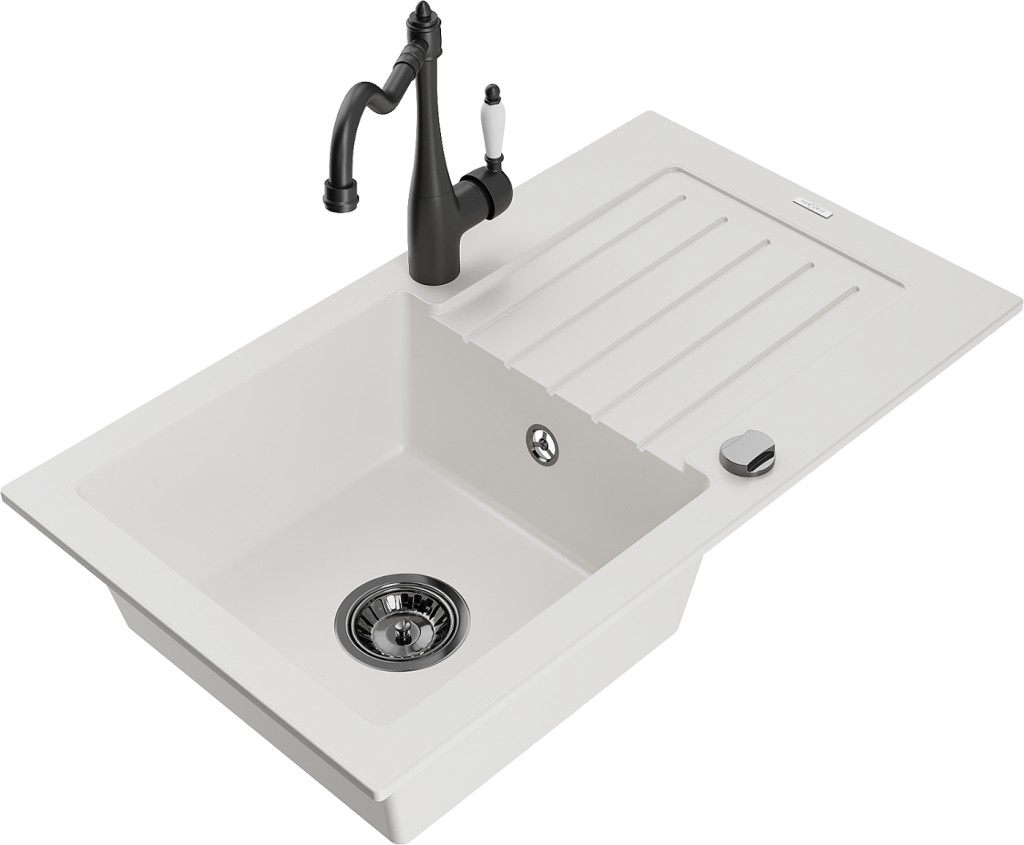 Technické dáta: drez: Rozmer: 752 x 436 x 161 mm Hĺbka komory: 151 mm Rozmery komory: 356x332 mm Priemer odtoku: ø90 mm Typ: 1-miska s odkvapkávačom Typ: Zapustené do pracovnej dosky biela farba Povrchová úprava sifónu: čierna Materiál: žula (80% žulové kamenivo, 20% živice) Prepadový otvor: Áno Otvory: (batérie, automatické) 2 Inštalácia: Univerzálna, je možné inštalovať s odkvapkávačom na ľavú alebo pravú stranu Vysoká odolnosť proti poškriabaniu a zmene farby Odolnosť proti tepelným šokom Ľahko čistiteľný povrch Dva dodatočné vyfrézované otvory na samodierovanie ø35 kuchynská batéria: Materiál: mosadz Čierna farba Hlava: Keramická Prevzdušňovač: Áno Typ: Jedna páka Výška batérie: 290 mm Rozsah výtoku: 260 mm(GT) Ean: 5905315039651