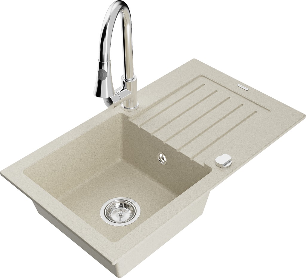 Technické dáta: drez: Rozmer: 752 x 436 x 161 mm Hĺbka komory: 151 mm Rozmery komory: 356x332 mm Priemer odtoku: ø90 mm Typ: 1-miska s odkvapkávačom Typ: Zapustené do pracovnej dosky Farba béžová Povrchová úprava sifónu: Chrome Materiál: žula (80% žulové kamenivo, 20% živice) Prepadový otvor: Áno Otvory: (batérie, automatické) 2 Inštalácia: Univerzálna, je možné inštalovať s odkvapkávačom na ľavú alebo pravú stranu Vysoká odolnosť proti poškriabaniu a zmene farby Odolnosť proti tepelným šokom Ľahko čistiteľný povrch Dva dodatočné vyfrézované otvory na samodierovanie ø35 kuchynská batéria: Materiál: mosadz Farba: Chrome Hlava: Keramická Prevzdušňovač: Áno Typ: Jedna páka Výška batérie: 380 mm Rozsah výtoku: 252 mm Typ výtoku: Výsuvný(GT) Ean: 5905315029416