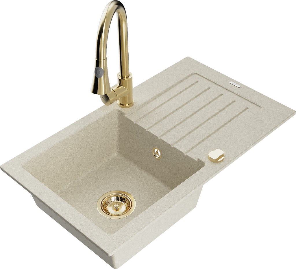 Technické dáta: drez: Rozmer: 752 x 436 x 161 mm Hĺbka komory: 151 mm Rozmery komory: 356x332 mm Priemer odtoku: ø90 mm Typ: 1-miska s odkvapkávačom Typ: Zapustené do pracovnej dosky Farba béžová Povrchová úprava sifónu: zlatá Materiál: žula (80% žulové kamenivo, 20% živice) Prepadový otvor: Áno Otvory: (batérie, automatické) 2 Inštalácia: Univerzálna, je možné inštalovať s odkvapkávačom na ľavú alebo pravú stranu Vysoká odolnosť proti poškriabaniu a zmene farby Odolnosť proti tepelným šokom Ľahko čistiteľný povrch Dva dodatočné vyfrézované otvory na samodierovanie ø35 kuchynská batéria: Materiál: mosadz Farba: Zlatá Hlava: Keramická Prevzdušňovač: Áno Typ: Jedna páka Výška batérie: 380 mm Rozsah výtoku: 252 mm Typ výtoku: Výsuvný(GT) Ean: 5905315029430