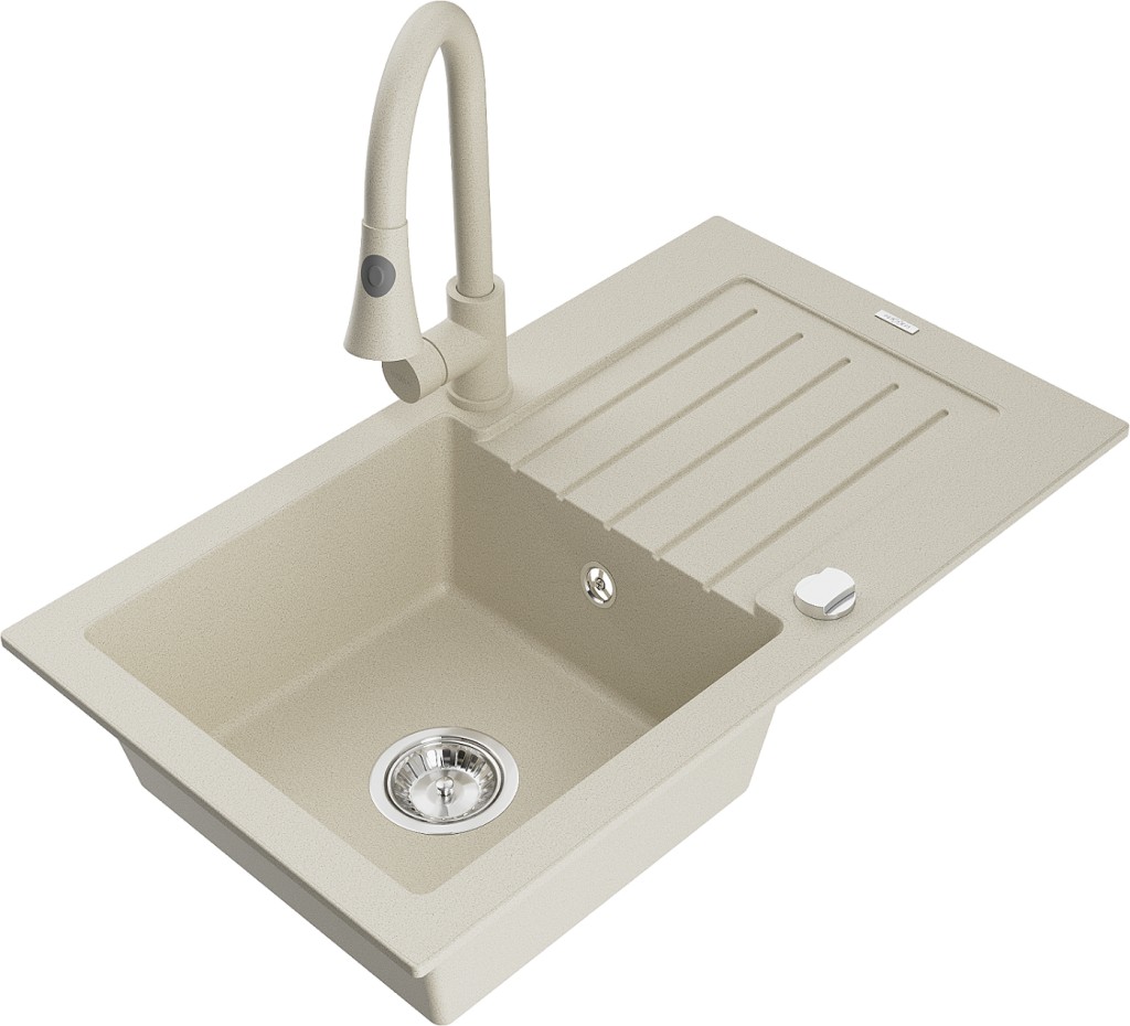 Technické dáta: drez: Rozmer: 752 x 436 x 161 mm Hĺbka komory: 151 mm Rozmery komory: 356x332 mm Priemer odtoku: ø90 mm Typ: 1-miska s odkvapkávačom Typ: Zapustené do pracovnej dosky Farba béžová Povrchová úprava sifónu: Chrome Materiál: žula (80% žulové kamenivo, 20% živice) Prepadový otvor: Áno Otvory: (batérie, automatické) 2 Inštalácia: Univerzálna, je možné inštalovať s odkvapkávačom na ľavú alebo pravú stranu Vysoká odolnosť proti poškriabaniu a zmene farby Odolnosť proti tepelným šokom Ľahko čistiteľný povrch Dva dodatočné vyfrézované otvory na samodierovanie ø35 kuchynská batéria: Materiál: mosadz Farba béžová Hlava: Keramická Prevzdušňovač: Áno Typ: Jedna páka Výška batérie: 380 mm Rozsah výtoku: 252 mm Typ výtoku: Výsuvný(GT) Ean: 5905315029423
