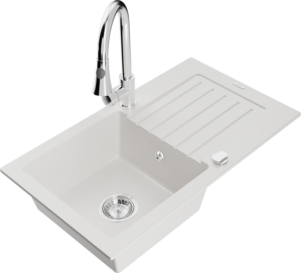 Technické dáta: drez: Rozmer: 752 x 436 x 161 mm Hĺbka komory: 151 mm Rozmery komory: 356x332 mm Priemer odtoku: ø90 mm Typ: 1-miska s odkvapkávačom Typ: Zapustené do pracovnej dosky biela farba Povrchová úprava sifónu: Chrome Materiál: žula (80% žulové kamenivo, 20% živice) Prepadový otvor: Áno Otvory: (batérie, automatické) 2 Inštalácia: Univerzálna, je možné inštalovať s odkvapkávačom na ľavú alebo pravú stranu Vysoká odolnosť proti poškriabaniu a zmene farby Odolnosť proti tepelným šokom Ľahko čistiteľný povrch Dva dodatočné vyfrézované otvory na samodierovanie ø35 kuchynská batéria: Materiál: mosadz Farba: Chrome Hlava: Keramická Prevzdušňovač: Áno Typ: Jedna páka Výška batérie: 380 mm Rozsah výtoku: 252 mm Typ výtoku: Výsuvný(GT) Ean: 5905315029379