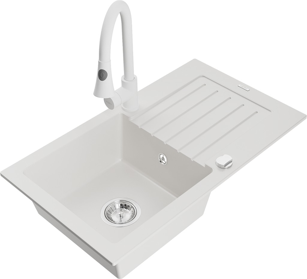 Technické dáta: drez: Rozmer: 752 x 436 x 161 mm Hĺbka komory: 151 mm Rozmery komory: 356x332 mm Priemer odtoku: ø90 mm Typ: 1-miska s odkvapkávačom Typ: Zapustené do pracovnej dosky biela farba Povrchová úprava sifónu: Chrome Materiál: žula (80% žulové kamenivo, 20% živice) Prepadový otvor: Áno Otvory: (batérie, automatické) 2 Inštalácia: Univerzálna, je možné inštalovať s odkvapkávačom na ľavú alebo pravú stranu Vysoká odolnosť proti poškriabaniu a zmene farby Odolnosť proti tepelným šokom Ľahko čistiteľný povrch Dva dodatočné vyfrézované otvory na samodierovanie ø35 kuchynská batéria: Materiál: mosadz biela farba Hlava: Keramická Prevzdušňovač: Áno Typ: Jedna páka Výška batérie: 380 mm Rozsah výtoku: 252 mm Typ výtoku: Výsuvný(GT) Ean: 5905315029386