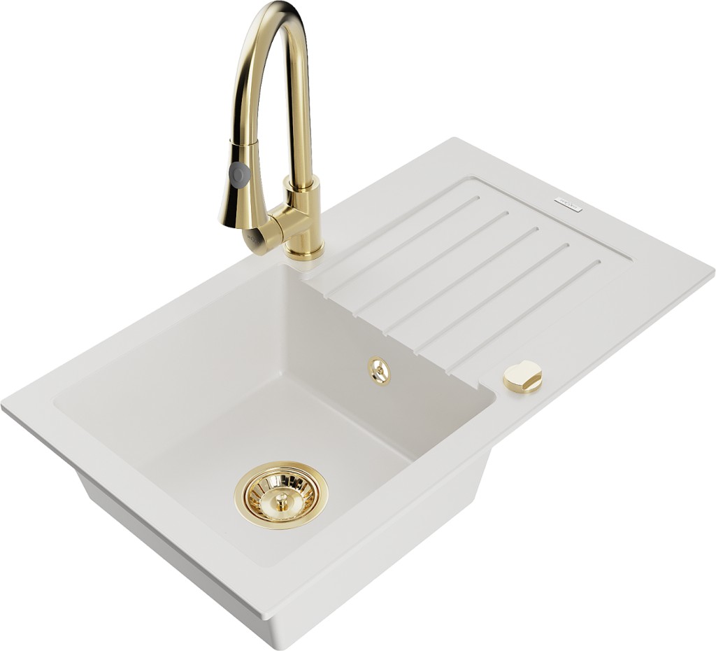 Technické dáta: drez: Rozmer: 752 x 436 x 161 mm Hĺbka komory: 151 mm Rozmery komory: 356x332 mm Priemer odtoku: ø90 mm Typ: 1-miska s odkvapkávačom Typ: Zapustené do pracovnej dosky biela farba Povrchová úprava sifónu: zlatá Materiál: žula (80% žulové kamenivo, 20% živice) Prepadový otvor: Áno Otvory: (batérie, automatické) 2 Inštalácia: Univerzálna, je možné inštalovať s odkvapkávačom na ľavú alebo pravú stranu Vysoká odolnosť proti poškriabaniu a zmene farby Odolnosť proti tepelným šokom Ľahko čistiteľný povrch Dva dodatočné vyfrézované otvory na samodierovanie ø35 kuchynská batéria: Materiál: mosadz Farba: Zlatá Hlava: Keramická Prevzdušňovač: Áno Typ: Jedna páka Výška batérie: 380 mm Rozsah výtoku: 252 mm Typ výtoku: Výsuvný(GT) Ean: 5905315029393