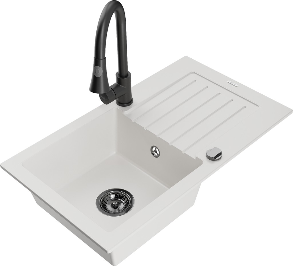 Technické dáta: drez: Rozmer: 752 x 436 x 161 mm Hĺbka komory: 151 mm Rozmery komory: 356x332 mm Priemer odtoku: ø90 mm Typ: 1-miska s odkvapkávačom Typ: Zapustené do pracovnej dosky biela farba Povrchová úprava sifónu: čierna Materiál: žula (80% žulové kamenivo, 20% živice) Prepadový otvor: Áno Otvory: (batérie, automatické) 2 Inštalácia: Univerzálna, je možné inštalovať s odkvapkávačom na ľavú alebo pravú stranu Vysoká odolnosť proti poškriabaniu a zmene farby Odolnosť proti tepelným šokom Ľahko čistiteľný povrch Dva dodatočné vyfrézované otvory na samodierovanie ø35 kuchynská batéria: Materiál: mosadz Čierna farba Hlava: Keramická Prevzdušňovač: Áno Typ: Jedna páka Výška batérie: 380 mm Rozsah výtoku: 252 mm Typ výtoku: Výsuvný(GT) Ean: 5905315029409