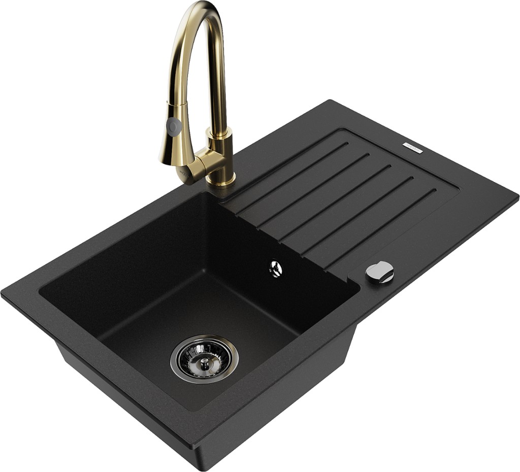 Technické dáta: drez: Rozmer: 752 x 436 x 161 mm Hĺbka komory: 151 mm Rozmery komory: 356x332 mm Priemer odtoku: ø90 mm Typ: 1-miska s odkvapkávačom Typ: Zapustené do pracovnej dosky Čierna farba Povrchová úprava sifónu: čierna Materiál: žula (80% žulové kamenivo, 20% živice) Prepadový otvor: Áno Otvory: (batérie, automatické) 2 Inštalácia: Univerzálna, je možné inštalovať s odkvapkávačom na ľavú alebo pravú stranu Vysoká odolnosť proti poškriabaniu a zmene farby Odolnosť proti tepelným šokom Ľahko čistiteľný povrch Dva dodatočné vyfrézované otvory na samodierovanie ø35 kuchynská batéria: Materiál: mosadz Farba: Zlatá Hlava: Keramická Prevzdušňovač: Áno Typ: Jedna páka Výška batérie: 380 mm Rozsah výtoku: 252 mm Typ výtoku: Výsuvný(GT) Ean: 5905315029669
