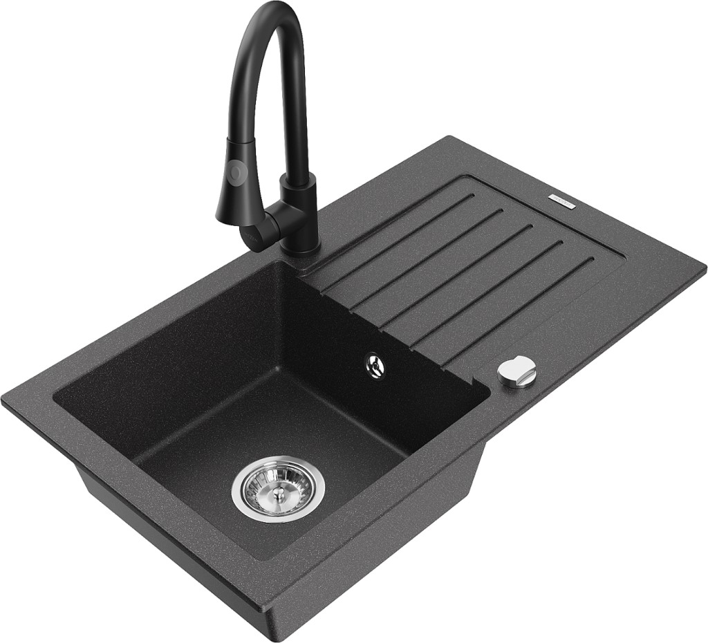 Technické dáta: drez: Rozmer: 752 x 436 x 161 mm Hĺbka komory: 151 mm Rozmery komory: 356x332 mm Priemer odtoku: ø90 mm Typ: 1-miska s odkvapkávačom Typ: Zapustené do pracovnej dosky Farba: Škvrnitá čierna Povrchová úprava sifónu: Chrome Materiál: žula (80% žulové kamenivo, 20% živice) Prepadový otvor: Áno Otvory: (batérie, automatické) 2 Inštalácia: Univerzálna, je možné inštalovať s odkvapkávačom na ľavú alebo pravú stranu Vysoká odolnosť proti poškriabaniu a zmene farby Odolnosť proti tepelným šokom Ľahko čistiteľný povrch Dva dodatočné vyfrézované otvory na samodierovanie ø35 kuchynská batéria: Materiál: mosadz Čierna farba Hlava: Keramická Prevzdušňovač: Áno Typ: Jedna páka Výška batérie: 380 mm Rozsah výtoku: 252 mm Typ výtoku: Výsuvný(GT) Ean: 5905315029614