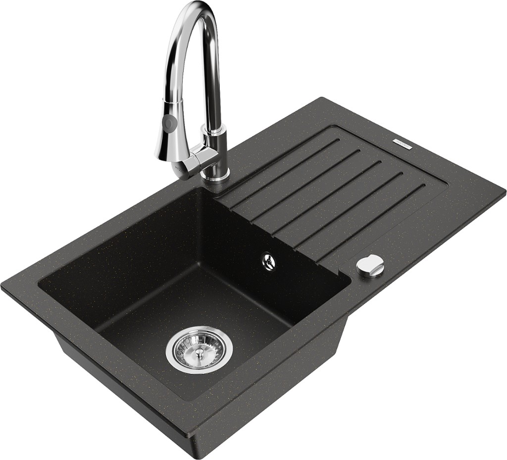 Technické dáta: Drez: Rozmer: 752x436x161 mm Hĺbka komory: 151 mm Rozmery komory: 356x332 mm Priemer odtoku: ø90 mm Typ: 1-miska s odkvapkávačom Typ: Zapustené do pracovnej dosky Farba: čierna / zlatá metalíza Povrchová úprava sifónu: Chrome Materiál: žula (80% žulové kamenivo 20% živice) Prepadový otvor: Áno Otvory: (batérie, automat) 2 Inštalácia: Univerzálna, je možné inštalovať s odkvapkávačom na ľavú alebo pravú stranu Vysoká odolnosť proti poškriabaniu a zmene farby Odolnosť proti tepelným šokom Povrch pre ľahké čistenie Dva dodatočné vyfrézované otvory na samodierovanie ø35 Kuchynská batéria: Materiál: mosadz Farba: Chrome Hlava: Keramická Perlátor: Áno Typ: Jednopákové Výška batérie: 380 mm Rozsah výtoku: 252 mm Typ výtoku: Výsuvný(GT) Ean: 5905315029546
