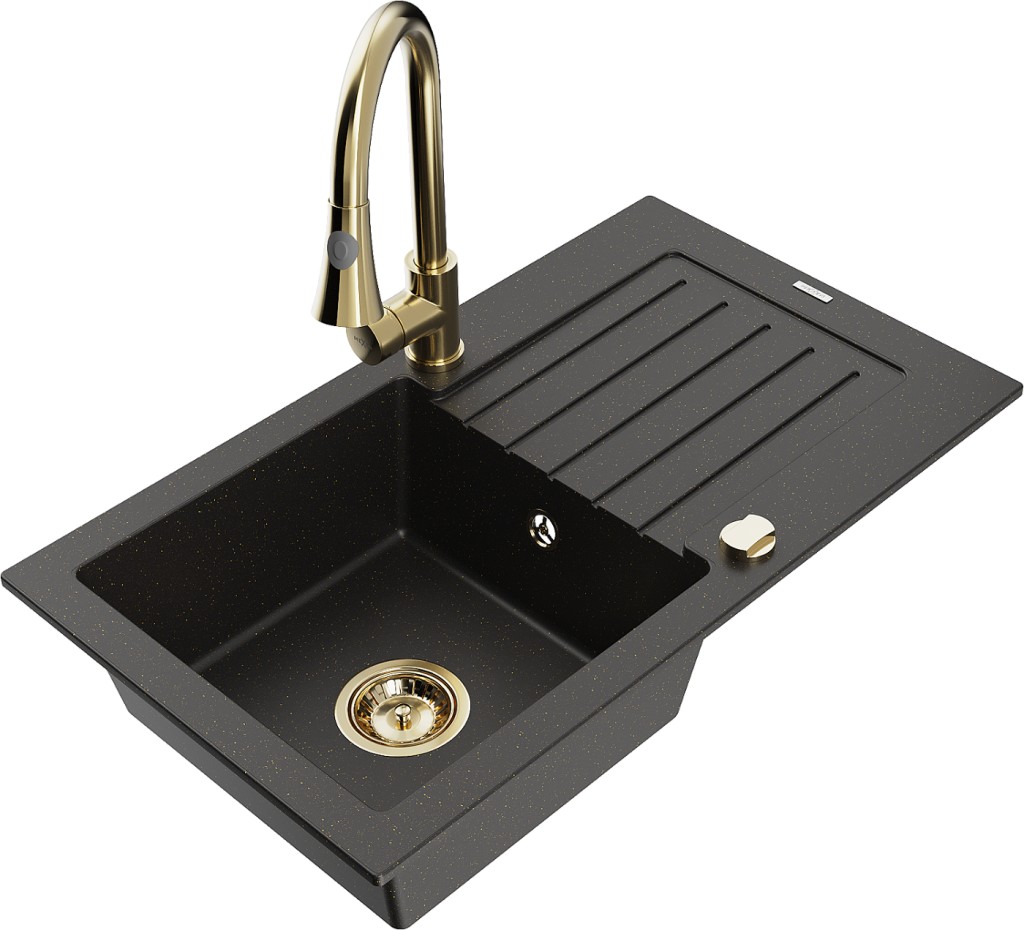 Technické dáta: Drez: Rozmer: 752x436x161 mm Hĺbka komory: 151 mm Rozmery komory: 356x332 mm Priemer odtoku: ø90 mm Typ: 1-miska s odkvapkávačom Typ: Zapustené do pracovnej dosky Farba: čierna / zlatá metalíza Povrchová úprava sifónu: zlatá Materiál: žula (80% žulové kamenivo 20% živice) Prepadový otvor: Áno Otvory: (batérie, automat) 2 Inštalácia: Univerzálna, je možné inštalovať s odkvapkávačom na ľavú alebo pravú stranu Vysoká odolnosť proti poškriabaniu a zmene farby Odolnosť proti tepelným šokom Povrch pre ľahké čistenie Dva dodatočné vyfrézované otvory na samodierovanie ø35 Kuchynská batéria: Materiál: mosadz Farba: Zlatá Hlava: Keramická Perlátor: Áno Typ: Jednopáková Výška batérie: 380 mm Rozsah výtoku: 252 mm Typ výtoku: Výsuvný(GT) Ean: 5905315029553