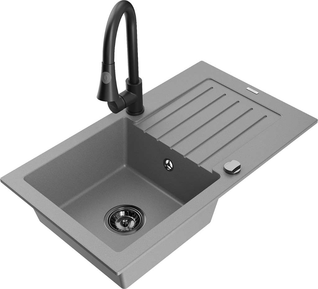 Technické dáta: drez: Rozmer: 752 x 436 x 161 mm Hĺbka komory: 151 mm Rozmery komory: 356x332 mm Priemer odtoku: ø90 mm Typ: 1-miska s odkvapkávačom Typ: Zapustené do pracovnej dosky Šedá farba Povrchová úprava sifónu: čierna Materiál: žula (80% žulové kamenivo, 20% živice) Prepadový otvor: Áno Otvory: (batérie, automatické) 2 Inštalácia: Univerzálna, je možné inštalovať s odkvapkávačom na ľavú alebo pravú stranu Vysoká odolnosť proti poškriabaniu a zmene farby Odolnosť proti tepelným šokom Ľahko čistiteľný povrch Dva dodatočné vyfrézované otvory na samodierovanie ø35 kuchynská batéria: Materiál: mosadz Čierna farba Hlava: Keramická Prevzdušňovač: Áno Typ: Jedna páka Výška batérie: 380 mm Rozsah výtoku: 252 mm Typ výtoku: Výsuvný(GT) Ean: 5905315029485