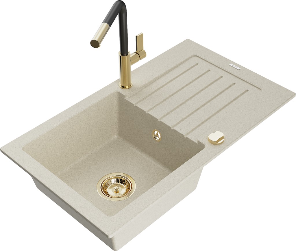 Technické dáta: drez: Rozmer: 752 x 436 x 161 mm Hĺbka komory: 151 mm Rozmery komory: 356x332 mm Priemer odtoku: ø90 mm Typ: 1-miska s odkvapkávačom Typ: Zapustené do pracovnej dosky Farba béžová Povrchová úprava sifónu: zlatá Materiál: žula (80% žulové kamenivo, 20% živice) Prepadový otvor: Áno Otvory: (batérie, automatické) 2 Inštalácia: Univerzálna, je možné inštalovať s odkvapkávačom na ľavú alebo pravú stranu Vysoká odolnosť proti poškriabaniu a zmene farby Odolnosť proti tepelným šokom Ľahko čistiteľný povrch Dva dodatočné vyfrézované otvory na samodierovanie ø35 kuchynská batéria: Materiál: mosadz Farba: Zlatá/Čierna Hlava: Keramická Prevzdušňovač: Áno Typ: Jedna páka Rozsah výtoku: 245 mm Výška batérie: 307 mm(GT) Ean: 5905315059574