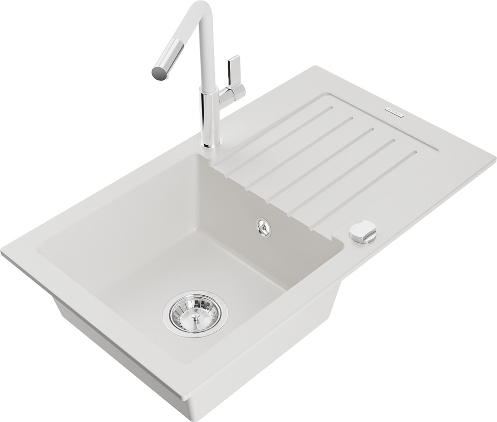 Technické dáta: drez: Rozmer: 752 x 436 x 161 mm Hĺbka komory: 151 mm Rozmery komory: 356x332 mm Priemer odtoku: ø90 mm Typ: 1-miska s odkvapkávačom Typ: Zapustené do pracovnej dosky biela farba Povrchová úprava sifónu: Chrome Materiál: žula (80% žulové kamenivo, 20% živice) Prepadový otvor: Áno Otvory: (batérie, automatické) 2 Inštalácia: Univerzálna, je možné inštalovať s odkvapkávačom na ľavú alebo pravú stranu Vysoká odolnosť proti poškriabaniu a zmene farby Odolnosť proti tepelným šokom Ľahko čistiteľný povrch Dva dodatočné vyfrézované otvory na samodierovanie ø35 kuchynská batéria: Materiál: mosadz Farba: chróm/biela Hlava: Keramická Prevzdušňovač: Áno Typ: Jedna páka Rozsah výtoku: 245 mm Výška batérie: 307 mm(GT) Ean: 5905315059468