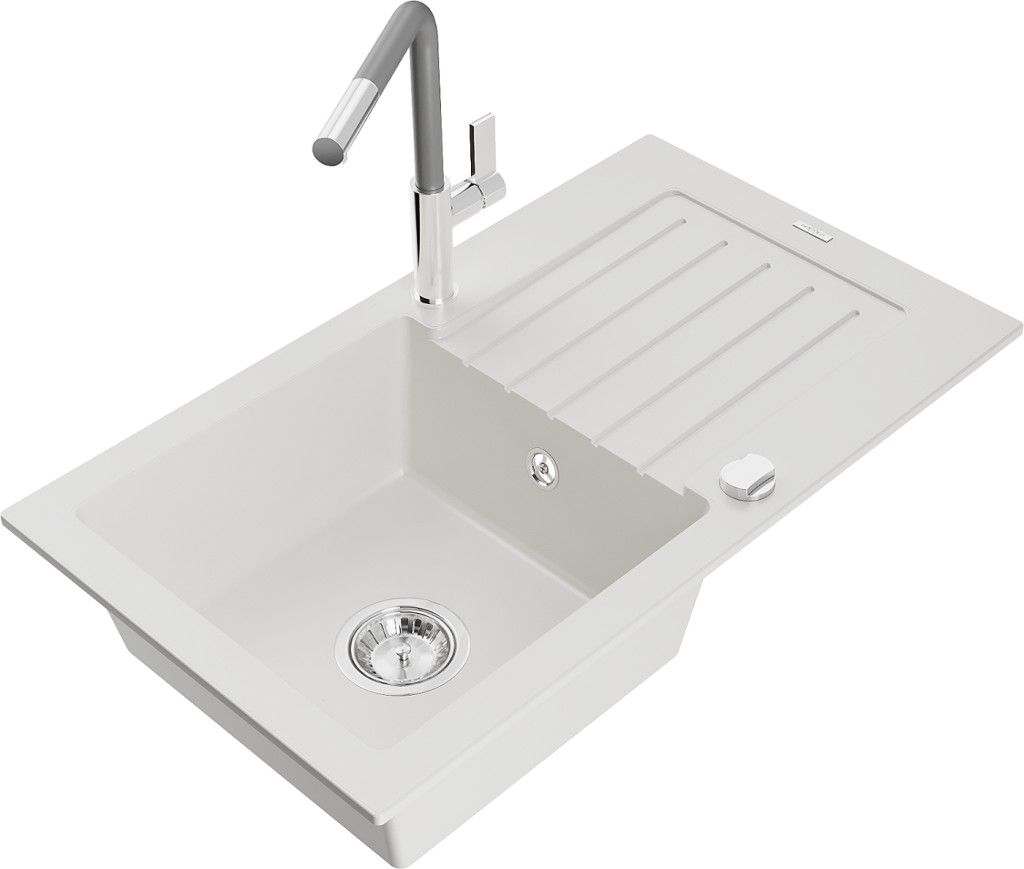 Technické dáta: drez: Rozmer: 752 x 436 x 161 mm Hĺbka komory: 151 mm Rozmery komory: 356x332 mm Priemer odtoku: ø90 mm Typ: 1-miska s odkvapkávačom Typ: Zapustené do pracovnej dosky biela farba Povrchová úprava sifónu: Chrome Materiál: žula (80% žulové kamenivo, 20% živice) Prepadový otvor: Áno Otvory: (batérie, automatické) 2 Inštalácia: Univerzálna, je možné inštalovať s odkvapkávačom na ľavú alebo pravú stranu Vysoká odolnosť proti poškriabaniu a zmene farby Odolnosť proti tepelným šokom Ľahko čistiteľný povrch Dva dodatočné vyfrézované otvory na samodierovanie ø35 kuchynská batéria: Materiál: mosadz Farba: chróm/sivá Hlava: Keramická Prevzdušňovač: Áno Typ: Jedna páka Rozsah výtoku: 245 mm Výška batérie: 307 mm(GT) Ean: 5905315059475