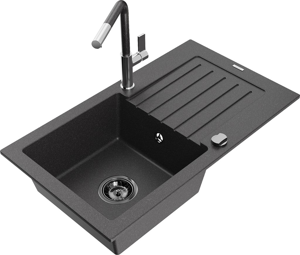 Technické dáta: drez: Rozmer: 752 x 436 x 161 mm Hĺbka komory: 151 mm Rozmery komory: 356x332 mm Priemer odtoku: ø90 mm Typ: 1-miska s odkvapkávačom Typ: Zapustené do pracovnej dosky Farba: Škvrnitá čierna Povrchová úprava sifónu: čierna Materiál: žula (80% žulové kamenivo, 20% živice) Prepadový otvor: Áno Otvory: (batérie, automatické) 2 Inštalácia: Univerzálna, je možné inštalovať s odkvapkávačom na ľavú alebo pravú stranu Vysoká odolnosť proti poškriabaniu a zmene farby Odolnosť proti tepelným šokom Ľahko čistiteľný povrch Dva dodatočné vyfrézované otvory na samodierovanie ø35 kuchynská batéria: Materiál: mosadz Farba: chróm/čierna škvrnitá Hlava: Keramická Prevzdušňovač: Áno Typ: Jedna páka Rozsah výtoku: 245 mm Výška batérie: 307 mm(GT) Ean: 5905315059833