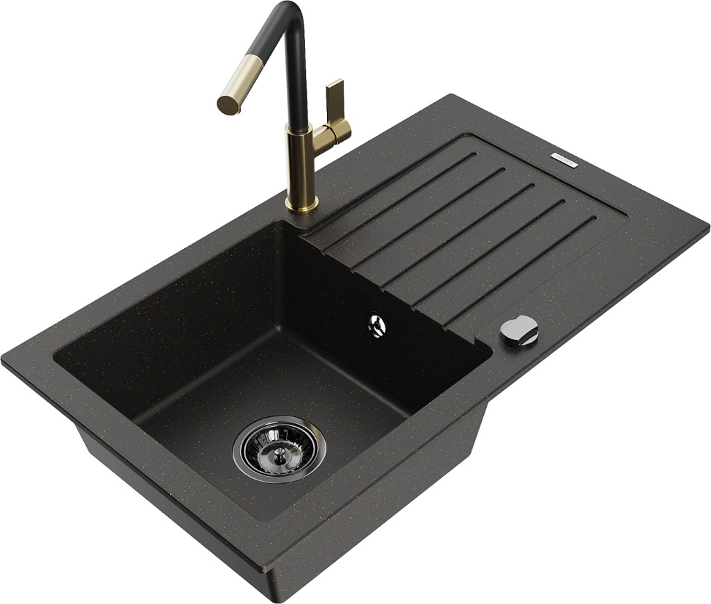 Technické dáta: drez: Rozmer: 752 x 436 x 161 mm Hĺbka komory: 151 mm Rozmery komory: 356x332 mm Priemer odtoku: ø90 mm Typ: 1-miska s odkvapkávačom Typ: Zapustené do pracovnej dosky Farba: čierna / zlatá metalíza Povrchová úprava sifónu: čierna Materiál: žula (80% žulové kamenivo, 20% živice) Prepadový otvor: Áno Otvory: (batérie, automatické) 2 Inštalácia: Univerzálna, je možné inštalovať s odkvapkávačom na ľavú alebo pravú stranu Vysoká odolnosť proti poškriabaniu a zmene farby Odolnosť proti tepelným šokom Ľahko čistiteľný povrch Dva dodatočné vyfrézované otvory na samodierovanie ø35 kuchynská batéria: Materiál: mosadz Farba: Zlatá/Čierna Hlava: Keramická Prevzdušňovač: Áno Typ: Jedna páka Rozsah výtoku: 245 mm Výška batérie: 307 mm(GT) Ean: 5905315059772
