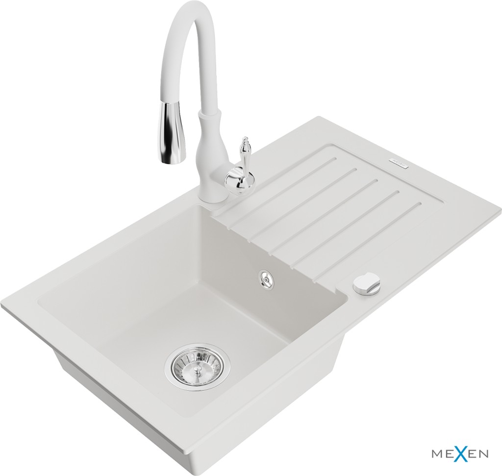 Technické dáta: drez: Rozmer: 752 x 436 x 161 mm Hĺbka komory: 151 mm Rozmery komory: 356x332 mm Priemer odtoku: ø90 mm Typ: 1-miska s odkvapkávačom Typ: Zapustené do pracovnej dosky biela farba Povrchová úprava sifónu: Chrome Materiál: žula (80% žulové kamenivo, 20% živice) Prepadový otvor: Áno Otvory: (batérie, automatické) 2 Inštalácia: Univerzálna, je možné inštalovať s odkvapkávačom na ľavú alebo pravú stranu Vysoká odolnosť proti poškriabaniu a zmene farby Odolnosť proti tepelným šokom Ľahko čistiteľný povrch Dva dodatočné vyfrézované otvory na samodierovanie ø35 kuchynská batéria: Materiál: mosadz biela farba Hlava: Keramická Prevzdušňovač: Áno Typ: Jedna páka Výška batérie: 410 mm Rozsah výtoku: 231 mm(GT) Ean: 5905315034502