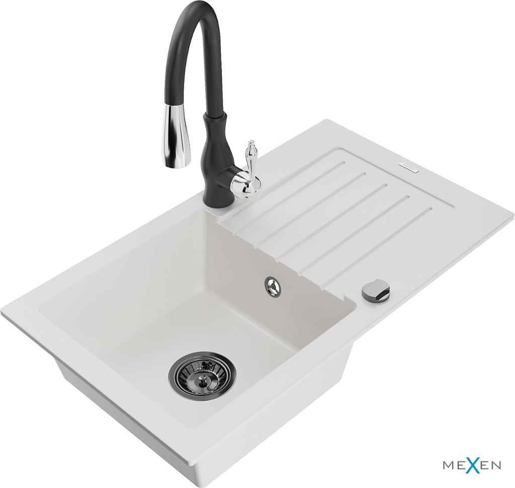 Technické dáta: drez: Rozmer: 752 x 436 x 161 mm Hĺbka komory: 151 mm Rozmery komory: 356x332 mm Priemer odtoku: ø90 mm Typ: 1-miska s odkvapkávačom Typ: Zapustené do pracovnej dosky biela farba Povrchová úprava sifónu: čierna Materiál: žula (80% žulové kamenivo, 20% živice) Prepadový otvor: Áno Otvory: (batérie, automatické) 2 Inštalácia: Univerzálna, je možné inštalovať s odkvapkávačom na ľavú alebo pravú stranu Vysoká odolnosť proti poškriabaniu a zmene farby Odolnosť proti tepelným šokom Ľahko čistiteľný povrch Dva dodatočné vyfrézované otvory na samodierovanie ø35 kuchynská batéria: Materiál: mosadz Čierna farba Hlava: Keramická Prevzdušňovač: Áno Typ: Jedna páka Výška batérie: 410 mm Rozsah výtoku: 231 mm(GT) Ean: 5905315034526