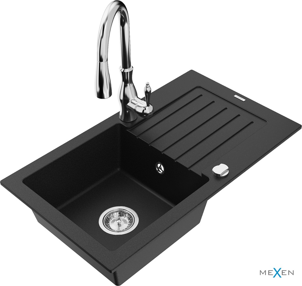 Technické dáta: drez: Rozmer: 752 x 436 x 161 mm Hĺbka komory: 151 mm Rozmery komory: 356x332 mm Priemer odtoku: ø90 mm Typ: 1-miska s odkvapkávačom Typ: Zapustené do pracovnej dosky Čierna farba Povrchová úprava sifónu: Chrome Materiál: žula (80% žulové kamenivo, 20% živice) Prepadový otvor: Áno Otvory: (batérie, automatické) 2 Inštalácia: Univerzálna, je možné inštalovať s odkvapkávačom na ľavú alebo pravú stranu Vysoká odolnosť proti poškriabaniu a zmene farby Odolnosť proti tepelným šokom Ľahko čistiteľný povrch Dva dodatočné vyfrézované otvory na samodierovanie ø35 kuchynská batéria: Materiál: mosadz Farba: Chrome Hlava: Keramická Prevzdušňovač: Áno Typ: Jedna páka Výška batérie: 410 mm Rozsah výtoku: 231 mm(GT) Ean: 5905315034755