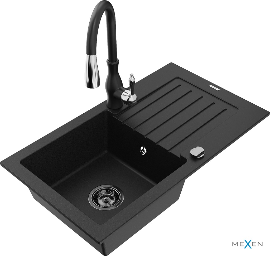 Technické dáta: drez: Rozmer: 752 x 436 x 161 mm Hĺbka komory: 151 mm Rozmery komory: 356x332 mm Priemer odtoku: ø90 mm Typ: 1-miska s odkvapkávačom Typ: Zapustené do pracovnej dosky Čierna farba Povrchová úprava sifónu: čierna Materiál: žula (80% žulové kamenivo, 20% živice) Prepadový otvor: Áno Otvory: (batérie, automatické) 2 Inštalácia: Univerzálna, je možné inštalovať s odkvapkávačom na ľavú alebo pravú stranu Vysoká odolnosť proti poškriabaniu a zmene farby Odolnosť proti tepelným šokom Ľahko čistiteľný povrch Dva dodatočné vyfrézované otvory na samodierovanie ø35 kuchynská batéria: Materiál: mosadz Čierna farba Hlava: Keramická Prevzdušňovač: Áno Typ: Jedna páka Výška batérie: 410 mm Rozsah výtoku: 231 mm(GT) Ean: 5905315034786