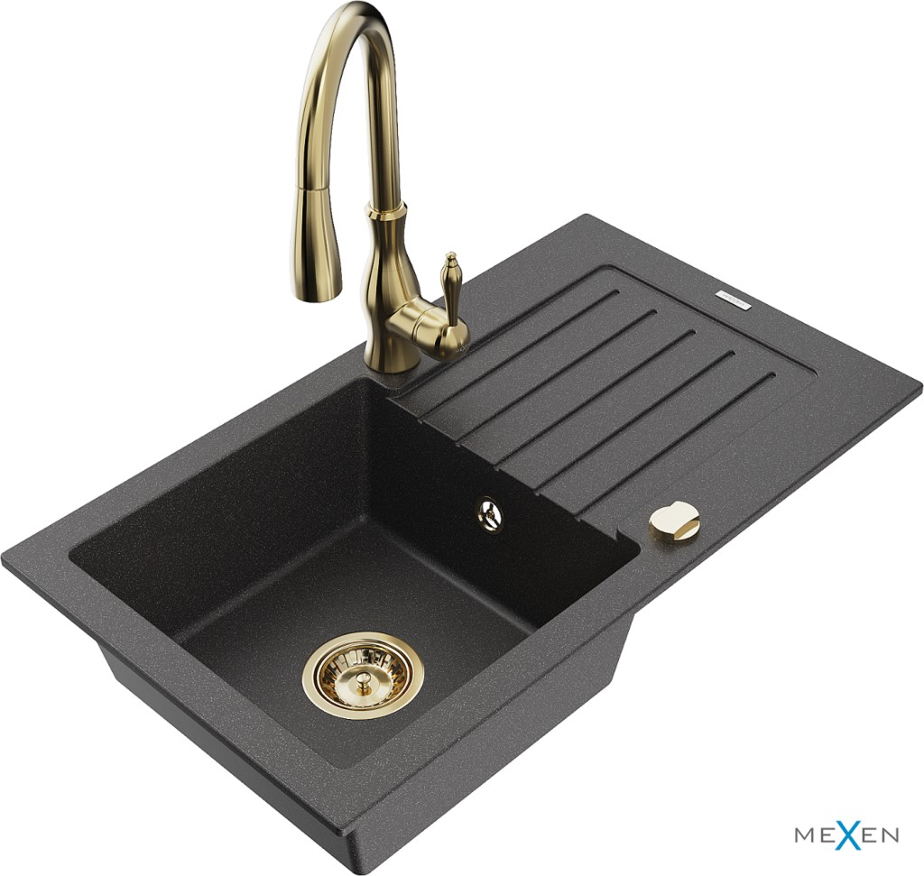 Technické dáta: drez: Rozmer: 752 x 436 x 161 mm Hĺbka komory: 151 mm Rozmery komory: 356x332 mm Priemer odtoku: ø90 mm Typ: 1-miska s odkvapkávačom Typ: Zapustené do pracovnej dosky Farba: Škvrnitá čierna Povrchová úprava sifónu: zlatá Materiál: žula (80% žulové kamenivo, 20% živice) Prepadový otvor: Áno Otvory: (batérie, automatické) 2 Inštalácia: Univerzálna, je možné inštalovať s odkvapkávačom na ľavú alebo pravú stranu Vysoká odolnosť proti poškriabaniu a zmene farby Odolnosť proti tepelným šokom Ľahko čistiteľný povrch Dva dodatočné vyfrézované otvory na samodierovanie ø35 kuchynská batéria: Materiál: mosadz Farba: Zlatá Hlava: Keramická Prevzdušňovač: Áno Typ: Jedna páka Výška batérie: 410 mm Rozsah výtoku: 231 mm(GT) Ean: 5905315034717