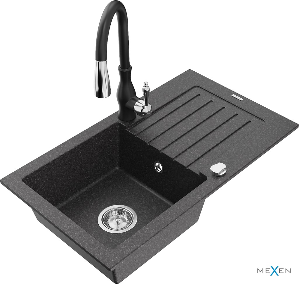 Technické dáta: drez: Rozmer: 752 x 436 x 161 mm Hĺbka komory: 151 mm Rozmery komory: 356x332 mm Priemer odtoku: ø90 mm Typ: 1-miska s odkvapkávačom Typ: Zapustené do pracovnej dosky Farba: Škvrnitá čierna Povrchová úprava sifónu: Chrome Materiál: žula (80% žulové kamenivo, 20% živice) Prepadový otvor: Áno Otvory: (batérie, automatické) 2 Inštalácia: Univerzálna, je možné inštalovať s odkvapkávačom na ľavú alebo pravú stranu Vysoká odolnosť proti poškriabaniu a zmene farby Odolnosť proti tepelným šokom Ľahko čistiteľný povrch Dva dodatočné vyfrézované otvory na samodierovanie ø35 kuchynská batéria: Materiál: mosadz Čierna farba Hlava: Keramická Prevzdušňovač: Áno Typ: Jedna páka Výška batérie: 410 mm Rozsah výtoku: 231 mm(GT) Ean: 5905315034724