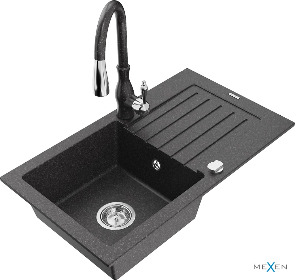 Technické dáta: drez: Rozmer: 752 x 436 x 161 mm Hĺbka komory: 151 mm Rozmery komory: 356x332 mm Priemer odtoku: ø90 mm Typ: 1-miska s odkvapkávačom Typ: Zapustené do pracovnej dosky Farba: Škvrnitá čierna Povrchová úprava sifónu: Chrome Materiál: žula (80% žulové kamenivo, 20% živice) Prepadový otvor: Áno Otvory: (batérie, automatické) 2 Inštalácia: Univerzálna, je možné inštalovať s odkvapkávačom na ľavú alebo pravú stranu Vysoká odolnosť proti poškriabaniu a zmene farby Odolnosť proti tepelným šokom Ľahko čistiteľný povrch Dva dodatočné vyfrézované otvory na samodierovanie ø35 kuchynská batéria: Materiál: mosadz Farba: Škvrnitá čierna Hlava: Keramická Prevzdušňovač: Áno Typ: Jedna páka Výška batérie: 410 mm Rozsah výtoku: 231 mm(GT) Ean: 5905315034748