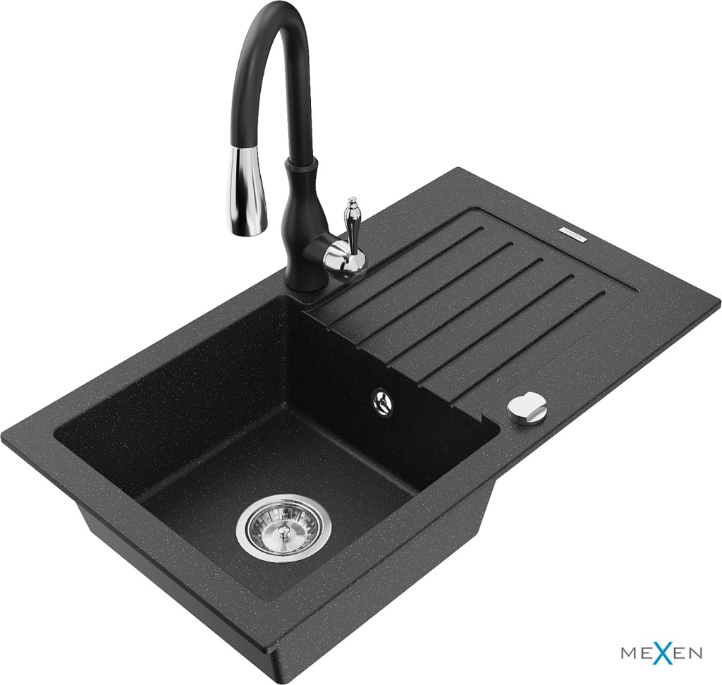 Technické dáta: drez: Rozmer: 752 x 436 x 161 mm Hĺbka komory: 151 mm Rozmery komory: 356x332 mm Priemer odtoku: ø90 mm Typ: 1-miska s odkvapkávačom Typ: Zapustené do pracovnej dosky Farba: čierna/strieborná metalíza Povrchová úprava sifónu: Chrome Materiál: žula (80% žulové kamenivo, 20% živice) Prepadový otvor: Áno Otvory: (batérie, automatické) 2 Inštalácia: Univerzálna, je možné inštalovať s odkvapkávačom na ľavú alebo pravú stranu Vysoká odolnosť proti poškriabaniu a zmene farby Odolnosť proti tepelným šokom Ľahko čistiteľný povrch Dva dodatočné vyfrézované otvory na samodierovanie ø35 kuchynská batéria: Materiál: mosadz Čierna farba Hlava: Keramická Prevzdušňovač: Áno Typ: Jedna páka Výška batérie: 410 mm Rozsah výtoku: 231 mm(GT) Ean: 5905315034632