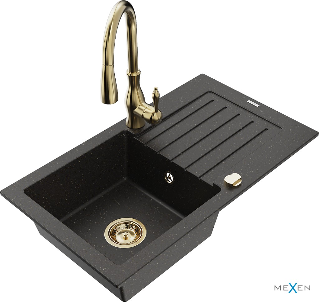 Technické dáta: drez: Rozmer: 752 x 436 x 161 mm Hĺbka komory: 151 mm Rozmery komory: 356x332 mm Priemer odtoku: ø90 mm Typ: 1-miska s odkvapkávačom Typ: Zapustené do pracovnej dosky Farba: čierna / zlatá metalíza Povrchová úprava sifónu: zlatá Materiál: žula (80% žulové kamenivo, 20% živice) Prepadový otvor: Áno Otvory: (batérie, automatické) 2 Inštalácia: Univerzálna, je možné inštalovať s odkvapkávačom na ľavú alebo pravú stranu Vysoká odolnosť proti poškriabaniu a zmene farby Odolnosť proti tepelným šokom Ľahko čistiteľný povrch Dva dodatočné vyfrézované otvory na samodierovanie ø35 kuchynská batéria: Materiál: mosadz Farba: Zlatá Hlava: Keramická Prevzdušňovač: Áno Typ: Jedna páka Výška batérie: 410 mm Rozsah výtoku: 231 mm(GT) Ean: 5905315034663