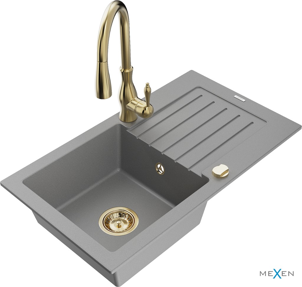 Technické dáta: drez: Rozmer: 752 x 436 x 161 mm Hĺbka komory: 151 mm Rozmery komory: 356x332 mm Priemer odtoku: ø90 mm Typ: 1-miska s odkvapkávačom Typ: Zapustené do pracovnej dosky Šedá farba Povrchová úprava sifónu: zlatá Materiál: žula (80% žulové kamenivo, 20% živice) Prepadový otvor: Áno Otvory: (batérie, automatické) 2 Inštalácia: Univerzálna, je možné inštalovať s odkvapkávačom na ľavú alebo pravú stranu Vysoká odolnosť proti poškriabaniu a zmene farby Odolnosť proti tepelným šokom Ľahko čistiteľný povrch Dva dodatočné vyfrézované otvory na samodierovanie ø35 kuchynská batéria: Materiál: mosadz Farba: Zlatá Hlava: Keramická Prevzdušňovač: Áno Typ: Jedna páka Výška batérie: 410 mm Rozsah výtoku: 231 mm(GT) Ean: 5905315034571