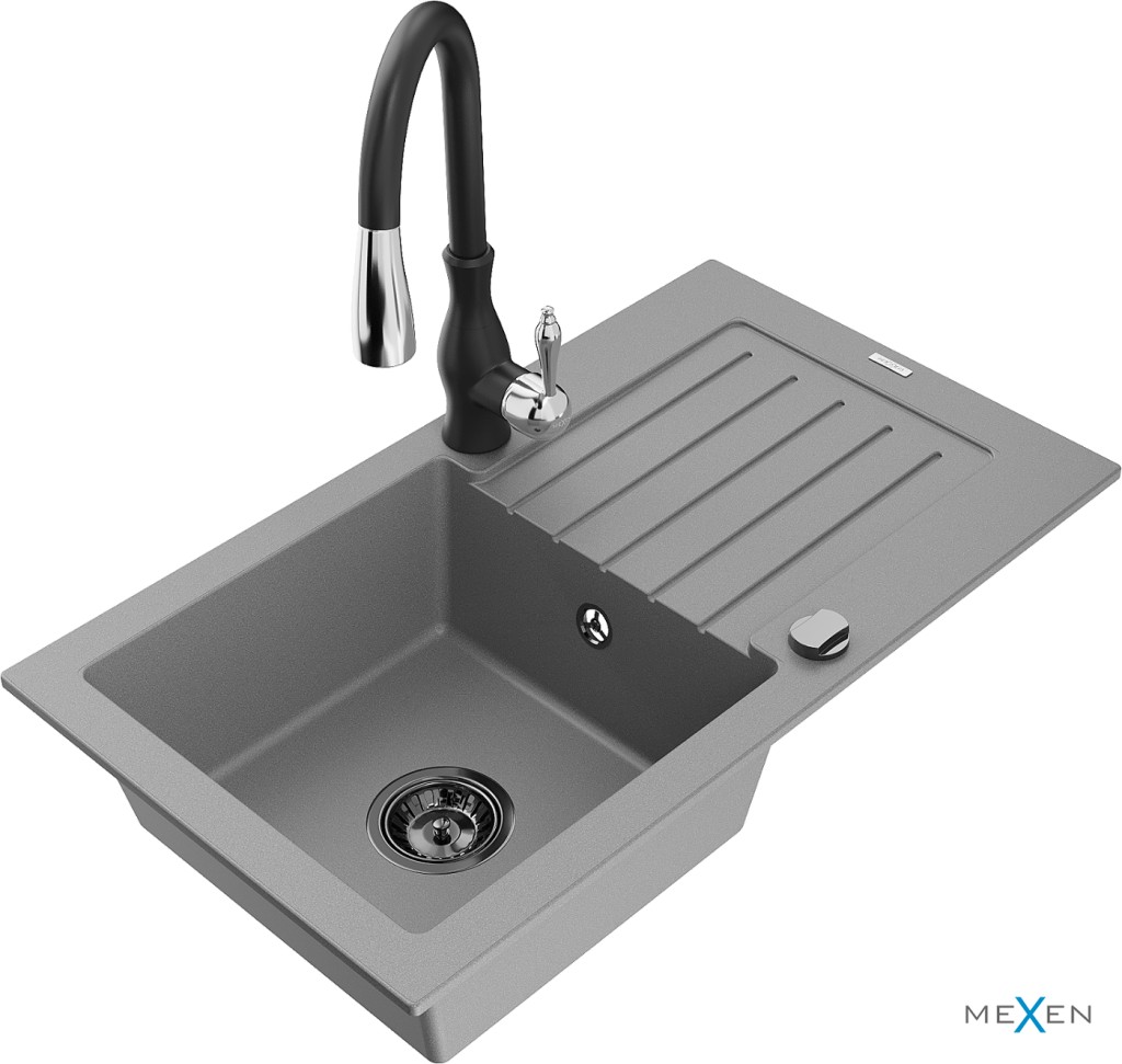 Technické dáta: drez: Rozmer: 752 x 436 x 161 mm Hĺbka komory: 151 mm Rozmery komory: 356x332 mm Priemer odtoku: ø90 mm Typ: 1-miska s odkvapkávačom Typ: Zapustené do pracovnej dosky Šedá farba Povrchová úprava sifónu: čierna Materiál: žula (80% žulové kamenivo, 20% živice) Prepadový otvor: Áno Otvory: (batérie, automatické) 2 Inštalácia: Univerzálna, je možné inštalovať s odkvapkávačom na ľavú alebo pravú stranu Vysoká odolnosť proti poškriabaniu a zmene farby Odolnosť proti tepelným šokom Ľahko čistiteľný povrch Dva dodatočné vyfrézované otvory na samodierovanie ø35 kuchynská batéria: Materiál: mosadz Čierna farba Hlava: Keramická Prevzdušňovač: Áno Typ: Jedna páka Výška batérie: 410 mm Rozsah výtoku: 231 mm(GT) Ean: 5905315034595
