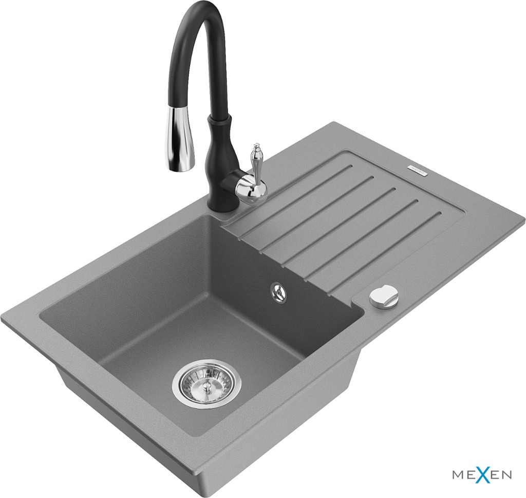 Technické dáta: drez: Rozmer: 752 x 436 x 161 mm Hĺbka komory: 151 mm Rozmery komory: 356x332 mm Priemer odtoku: ø90 mm Typ: 1-miska s odkvapkávačom Typ: Zapustené do pracovnej dosky Šedá farba Povrchová úprava sifónu: Chrome Materiál: žula (80% žulové kamenivo, 20% živice) Prepadový otvor: Áno Otvory: (batérie, automatické) 2 Inštalácia: Univerzálna, je možné inštalovať s odkvapkávačom na ľavú alebo pravú stranu Vysoká odolnosť proti poškriabaniu a zmene farby Odolnosť proti tepelným šokom Ľahko čistiteľný povrch Dva dodatočné vyfrézované otvory na samodierovanie ø35 kuchynská batéria: Materiál: mosadz Čierna farba Hlava: Keramická Prevzdušňovač: Áno Typ: Jedna páka Výška batérie: 410 mm Rozsah výtoku: 231 mm(GT) Ean: 5905315034588