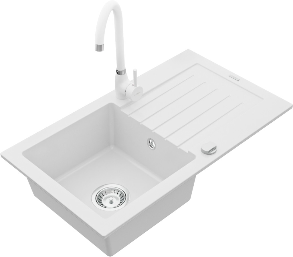 Technické dáta: drez: Rozmer: 752 x 436 x 161 mm Hĺbka komory: 151 mm Rozmery komory: 356x332 mm Priemer odtoku: ø90 mm Typ: 1-miska s odkvapkávačom Typ: Zapustené do pracovnej dosky biela farba Povrchová úprava sifónu: Chrome Materiál: žula (80% žulové kamenivo, 20% živice) Prepadový otvor: Áno Otvory: (batérie, automatické) 2 Inštalácia: Univerzálna, je možné inštalovať s odkvapkávačom na ľavú alebo pravú stranu Vysoká odolnosť proti poškriabaniu a zmene farby Odolnosť proti tepelným šokom Ľahko čistiteľný povrch Dva dodatočné vyfrézované otvory na samodierovanie ø35 kuchynská batéria: Materiál: mosadz biela farba Hlava: Keramická Prevzdušňovač: Áno Výška batérie: 335 mm Rozsah výtoku: 180 mm(GT) Ean: 5907709160163