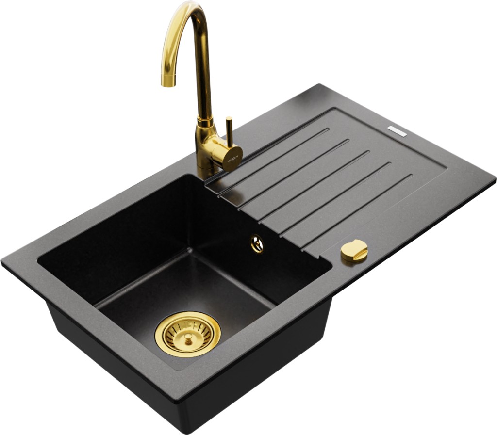 Technické dáta: drez: Rozmer: 752 x 436 x 161 mm Hĺbka komory: 151 mm Rozmery komory: 356x332 mm Priemer odtoku: ø90 mm Typ: 1-miska s odkvapkávačom Typ: Zapustené do pracovnej dosky Čierna farba Povrchová úprava sifónu: zlatá Materiál: žula (80% žulové kamenivo, 20% živice) Prepadový otvor: Áno Otvory: (batérie, automatické) 2 Inštalácia: Univerzálna, je možné inštalovať s odkvapkávačom na ľavú alebo pravú stranu Vysoká odolnosť proti poškriabaniu a zmene farby Odolnosť proti tepelným šokom Ľahko čistiteľný povrch Dva dodatočné vyfrézované otvory na samodierovanie ø35 kuchynská batéria: Materiál: mosadz Farba: Zlatá Hlava: Keramická Prevzdušňovač: Áno Výška batérie: 335 mm Rozsah výtoku: 180 mm(GT) Ean: 5907709160286