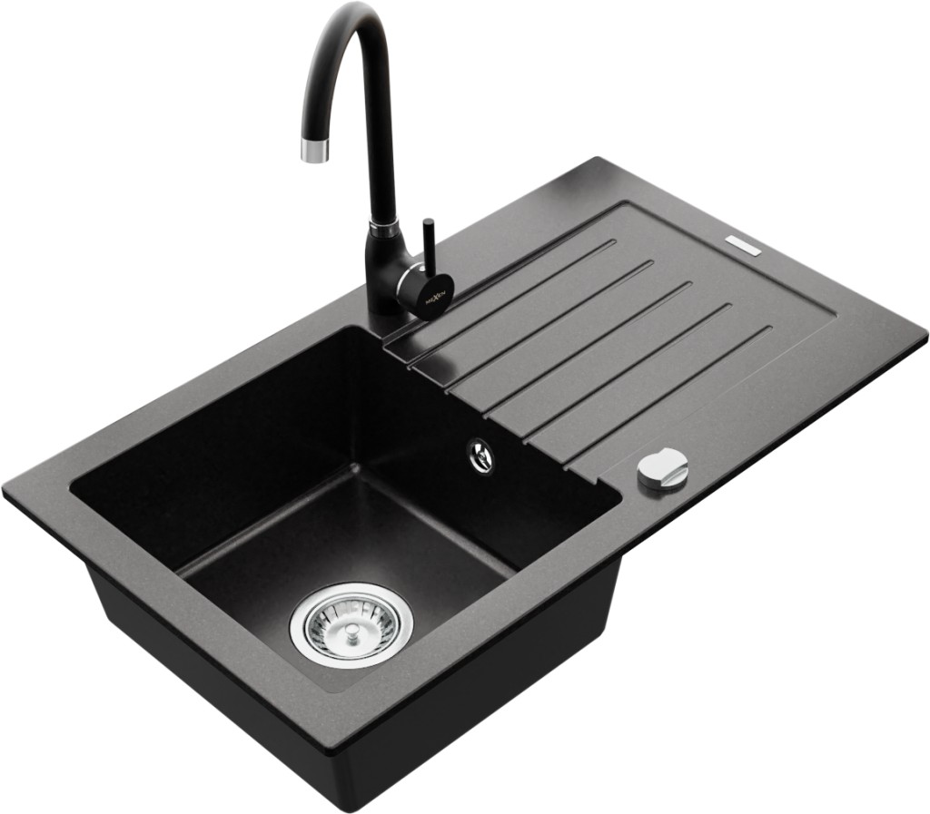 Technické dáta: drez: Rozmer: 752 x 436 x 161 mm Hĺbka komory: 151 mm Rozmery komory: 356x332 mm Priemer odtoku: ø90 mm Typ: 1-miska s odkvapkávačom Typ: Zapustené do pracovnej dosky Čierna farba Povrchová úprava sifónu: Chrome Materiál: žula (80% žulové kamenivo, 20% živice) Prepadový otvor: Áno Otvory: (batérie, automatické) 2 Inštalácia: Univerzálna, je možné inštalovať s odkvapkávačom na ľavú alebo pravú stranu Vysoká odolnosť proti poškriabaniu a zmene farby Odolnosť proti tepelným šokom Ľahko čistiteľný povrch Dva dodatočné vyfrézované otvory na samodierovanie ø35 kuchynská batéria: Materiál: mosadz Čierna farba Hlava: Keramická Prevzdušňovač: Áno Výška batérie: 335 mm Rozsah výtoku: 180 mm(GT) Ean: 5907709160293