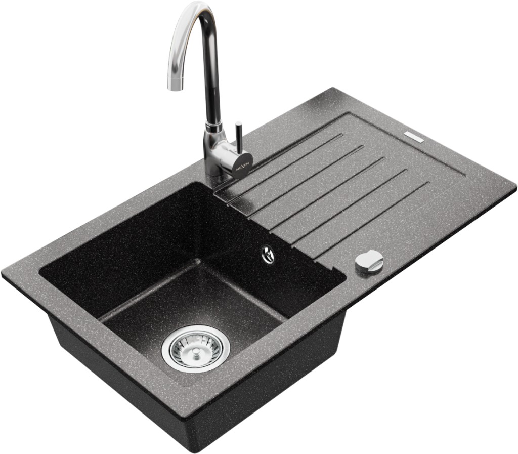 Technické dáta: drez: Rozmer: 752 x 436 x 161 mm Hĺbka komory: 151 mm Rozmery komory: 356x332 mm Priemer odtoku: ø90 mm Typ: 1-miska s odkvapkávačom Typ: Zapustené do pracovnej dosky Farba: Škvrnitá čierna Povrchová úprava sifónu: Chrome Materiál: žula (80% žulové kamenivo, 20% živice) Prepadový otvor: Áno Otvory: (batérie, automatické) 2 Inštalácia: Univerzálna, je možné inštalovať s odkvapkávačom na ľavú alebo pravú stranu Vysoká odolnosť proti poškriabaniu a zmene farby Odolnosť proti tepelným šokom Ľahko čistiteľný povrch Dva dodatočné vyfrézované otvory na samodierovanie ø35 kuchynská batéria: Materiál: mosadz Farba: Chrome Hlava: Keramická Prevzdušňovač: Áno Výška batérie: 335 mm Rozsah výtoku: 180 mm(GT) Ean: 5907709160255