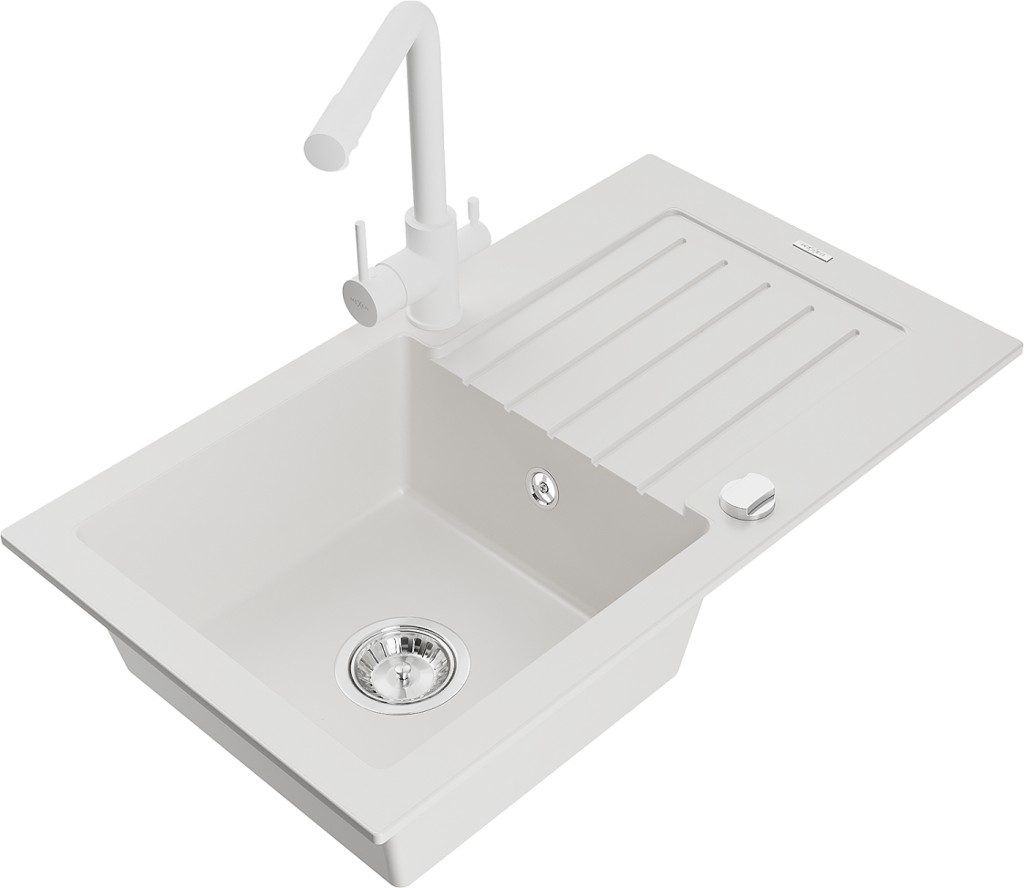 Technické dáta: drez: Rozmer: 752 x 436 x 161 mm Hĺbka komory: 151 mm Rozmery komory: 356x332 mm Priemer odtoku: ø90 mm Typ: 1-miska s odkvapkávačom Typ: Zapustené do pracovnej dosky biela farba Povrchová úprava sifónu: Chrome Materiál: žula (80% žulové kamenivo, 20% živice) Prepadový otvor: Áno Otvory: (batérie, automatické) 2 Inštalácia: Univerzálna, je možné inštalovať s odkvapkávačom na ľavú alebo pravú stranu Vysoká odolnosť proti poškriabaniu a zmene farby Odolnosť proti tepelným šokom Ľahko čistiteľný povrch Dva dodatočné vyfrézované otvory na samodierovanie ø35 kuchynská batéria: Materiál: mosadz biela farba Hlava: Keramická Prevzdušňovač: Áno Typ: Dve rukoväte Rozsah výtoku: 235 mm Výška batérie: 315 mm Dvojhlavá batéria s prídavným kanálom pre filtrovanú pitnú vodu(GT) Ean: 5905315024268