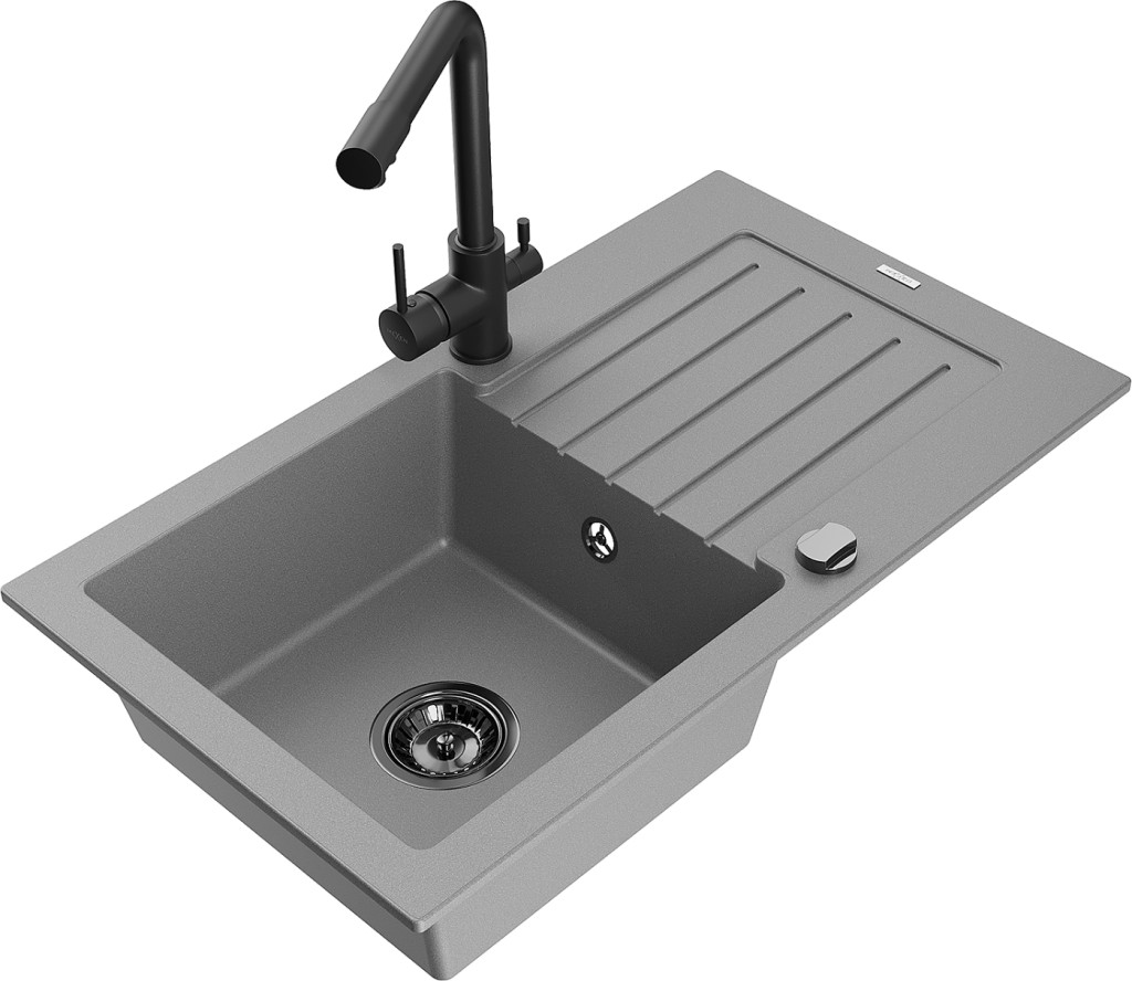 Technické dáta: drez: Rozmer: 752 x 436 x 161 mm Hĺbka komory: 151 mm Rozmery komory: 356x332 mm Priemer odtoku: ø90 mm Typ: 1-miska s odkvapkávačom Typ: Zapustené do pracovnej dosky Šedá farba Povrchová úprava sifónu: čierna Materiál: žula (80% žulové kamenivo, 20% živice) Prepadový otvor: Áno Otvory: (batérie, automatické) 2 Inštalácia: Univerzálna, je možné inštalovať s odkvapkávačom na ľavú alebo pravú stranu Vysoká odolnosť proti poškriabaniu a zmene farby Odolnosť proti tepelným šokom Ľahko čistiteľný povrch Dva dodatočné vyfrézované otvory na samodierovanie ø35 kuchynská batéria: Materiál: mosadz Čierna farba Hlava: Keramická Prevzdušňovač: Áno Typ: Dve rukoväte Rozsah výtoku: 235 mm Výška batérie: 315 mm Dvojhlavá batéria s prídavným kanálom pre filtrovanú pitnú vodu(GT) Ean: 5905315024367