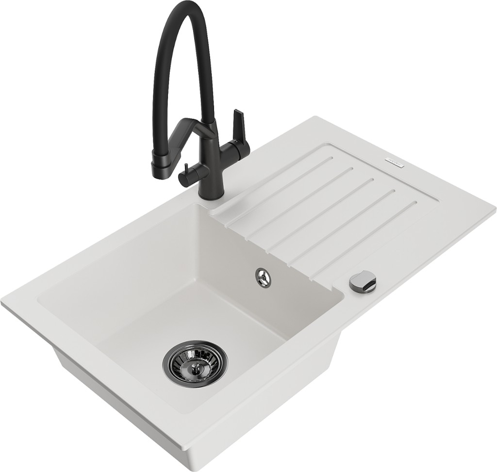 Technické dáta: drez: Rozmer: 752 x 436 x 161 mm Hĺbka komory: 151 mm Rozmery komory: 356x332 mm Priemer odtoku: ø90 mm Typ: 1-miska s odkvapkávačom Typ: Zapustené do pracovnej dosky biela farba Povrchová úprava sifónu: čierna Materiál: žula (80% žulové kamenivo, 20% živice) Prepadový otvor: Áno Otvory: (batérie, automatické) 2 Inštalácia: Univerzálna, je možné inštalovať s odkvapkávačom na ľavú alebo pravú stranu Vysoká odolnosť proti poškriabaniu a zmene farby Odolnosť proti tepelným šokom Ľahko čistiteľný povrch Dva dodatočné vyfrézované otvory na samodierovanie ø35 kuchynská batéria: Materiál: mosadz Čierna farba Hlavy: Keramické Prevzdušňovač: Áno Typ hubica: Flexibilný s mosadzným držiakom Rozsah výtoku: 260 mm Výška: 405 mm Typ: Dve rukoväte Dvojhlavá batéria s prídavným filtrom na pitnú vodu(GT) Ean: 5905315100856