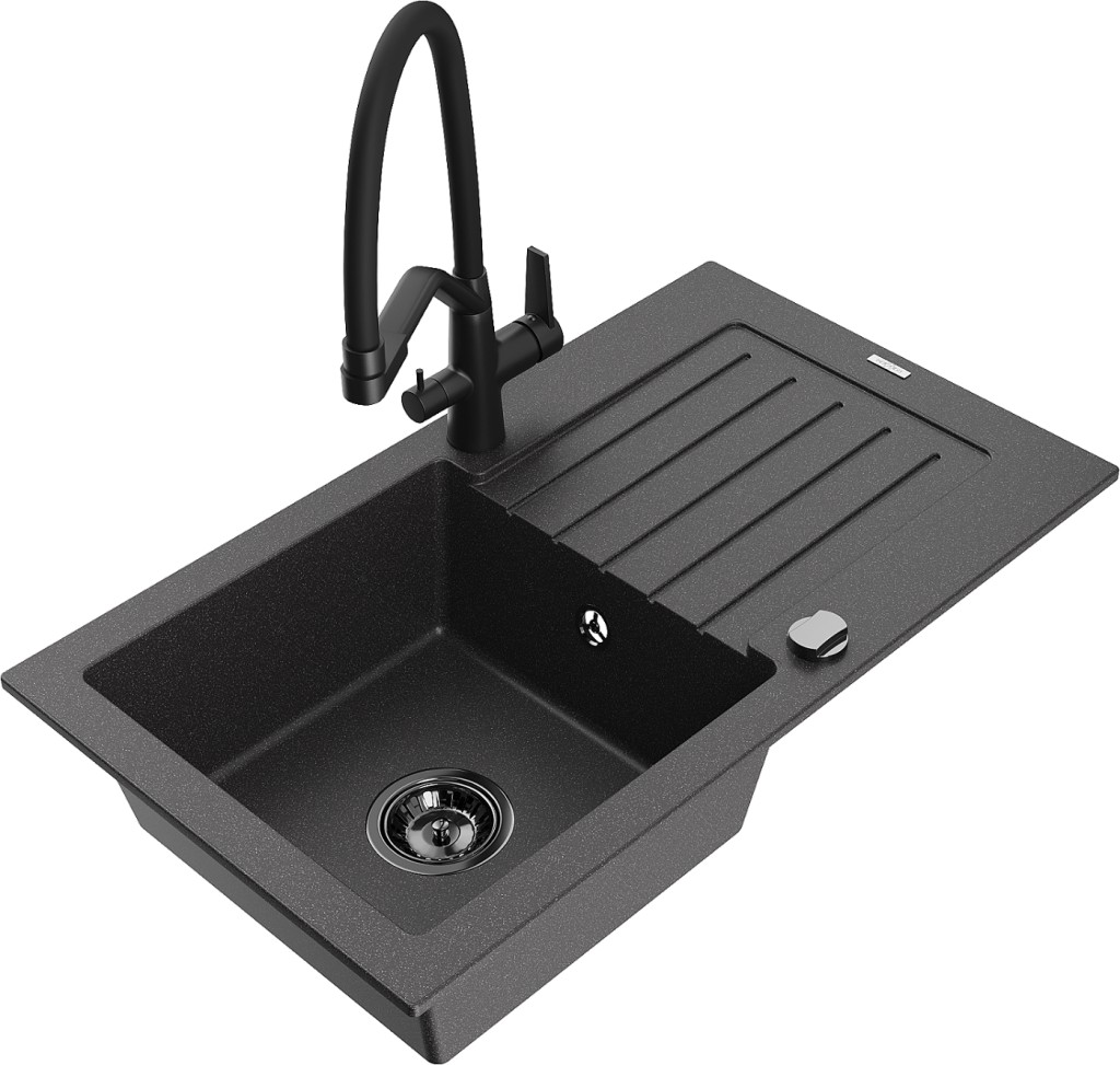 Technické dáta: drez: Rozmer: 752 x 436 x 161 mm Hĺbka komory: 151 mm Rozmery komory: 356x332 mm Priemer odtoku: ø90 mm Typ: 1-miska s odkvapkávačom Typ: Zapustené do pracovnej dosky Farba: Škvrnitá čierna Povrchová úprava sifónu: čierna Materiál: žula (80% žulové kamenivo, 20% živice) Prepadový otvor: Áno Otvory: (batérie, automatické) 2 Inštalácia: Univerzálna, je možné inštalovať s odkvapkávačom na ľavú alebo pravú stranu Vysoká odolnosť proti poškriabaniu a zmene farby Odolnosť proti tepelným šokom Ľahko čistiteľný povrch Dva dodatočné vyfrézované otvory na samodierovanie ø35 kuchynská batéria: Materiál: mosadz Čierna farba Hlavy: Keramické Prevzdušňovač: Áno Typ hubica: Flexibilný s mosadzným držiakom Rozsah výtoku: 260 mm Výška: 405 mm Typ: Dve rukoväte Dvojhlavá batéria s prídavným filtrom na pitnú vodu(GT) Ean: 5905315101105