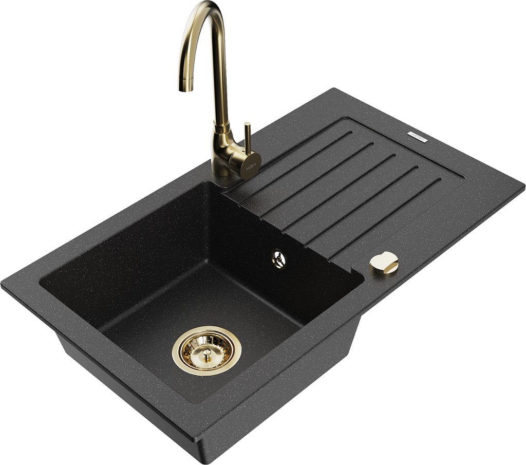 Technické dáta: drez: Rozmer: 752 x 436 x 161 mm Hĺbka komory: 151 mm Rozmery komory: 356x332 mm Priemer odtoku: ø90 mm Typ: 1-miska s odkvapkávačom Typ: Zapustené do pracovnej dosky Farba: čierna/strieborná metalíza Povrchová úprava sifónu: zlatá Materiál: žula (80% žulové kamenivo, 20% živice) Prepadový otvor: Áno Otvory: (batérie, automatické) 2 Inštalácia: Univerzálna, je možné inštalovať s odkvapkávačom na ľavú alebo pravú stranu Vysoká odolnosť proti poškriabaniu a zmene farby Odolnosť proti tepelným šokom Ľahko čistiteľný povrch Dva dodatočné vyfrézované otvory na samodierovanie ø35 kuchynská batéria: Materiál: mosadz Farba: Zlatá Hlava: Keramická Prevzdušňovač: Áno Typ: Jedna páka Výška batérie: 335 mm Rozsah výtoku: 180 mm (GT) Ean: 5905315014986