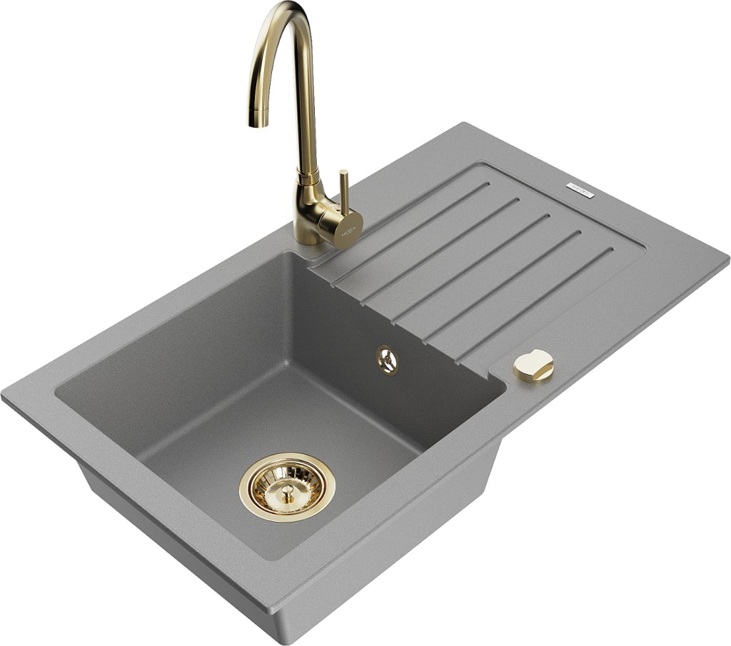 Technické dáta: drez: Rozmer: 752 x 436 x 161 mm Hĺbka komory: 151 mm Rozmery komory: 356x332 mm Priemer odtoku: ø90 mm Typ: 1-miska s odkvapkávačom Typ: Zapustené do pracovnej dosky Šedá farba Povrchová úprava sifónu: zlatá Materiál: žula (80% žulové kamenivo, 20% živice) Prepadový otvor: Áno Otvory: (batérie, automatické) 2 Inštalácia: Univerzálna, je možné inštalovať s odkvapkávačom na ľavú alebo pravú stranu Vysoká odolnosť proti poškriabaniu a zmene farby Odolnosť proti tepelným šokom Ľahko čistiteľný povrch Dva dodatočné vyfrézované otvory na samodierovanie ø35 kuchynská batéria: Materiál: mosadz Farba: Zlatá Hlava: Keramická Prevzdušňovač: Áno Typ: Jedna páka Výška batérie: 335 mm Rozsah výtoku: 180 mm(GT) Ean: 5905315014955