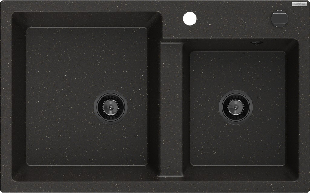 Technické dáta: Rozmer: 800 x 500 x 190 mm Hĺbka komory: 180 mm (väčšia), 180 mm (menšia) Rozmery komory: 440x387 mm (väčšie), 370x303 mm (menšie) Priemer odtoku: ø90 mm Typ: 2-komorový Typ: Zapustené do pracovnej dosky Materiál: žula Farba: čierna / zlatá metalíza Povrchová úprava sifónu: čierna Prepadový otvor: Áno Otvor pre batériu: Áno Vrátane automatického sifónu Vysoká odolnosť proti poškriabaniu a zmene farby Odolnosť proti tepelným šokom Ľahko čistiteľný povrch(GT) Ean: 5905315013552