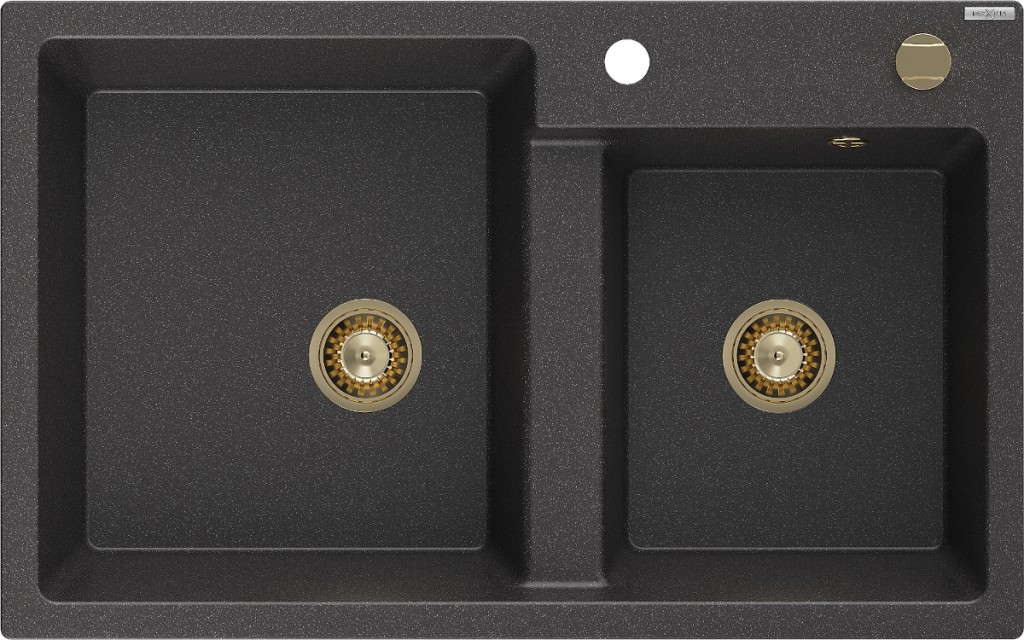 Technické dáta: Rozmer: 800 x 500 x 190 mm Hĺbka komory: 180 mm (väčšia), 180 mm (menšia) Rozmery komory: 440x387 mm (väčšie), 370x303 mm (menšie) Priemer odtoku: ø90 mm Typ: 2-komorový Typ: Zapustené do pracovnej dosky Materiál: žula Farba: Škvrnitá čierna Povrchová úprava sifónu: zlatá Prepadový otvor: Áno Otvor pre batériu: Áno Vrátane automatického sifónu Vysoká odolnosť proti poškriabaniu a zmene farby Odolnosť proti tepelným šokom Ľahko čistiteľný povrch(GT) Ean: 5905315012371