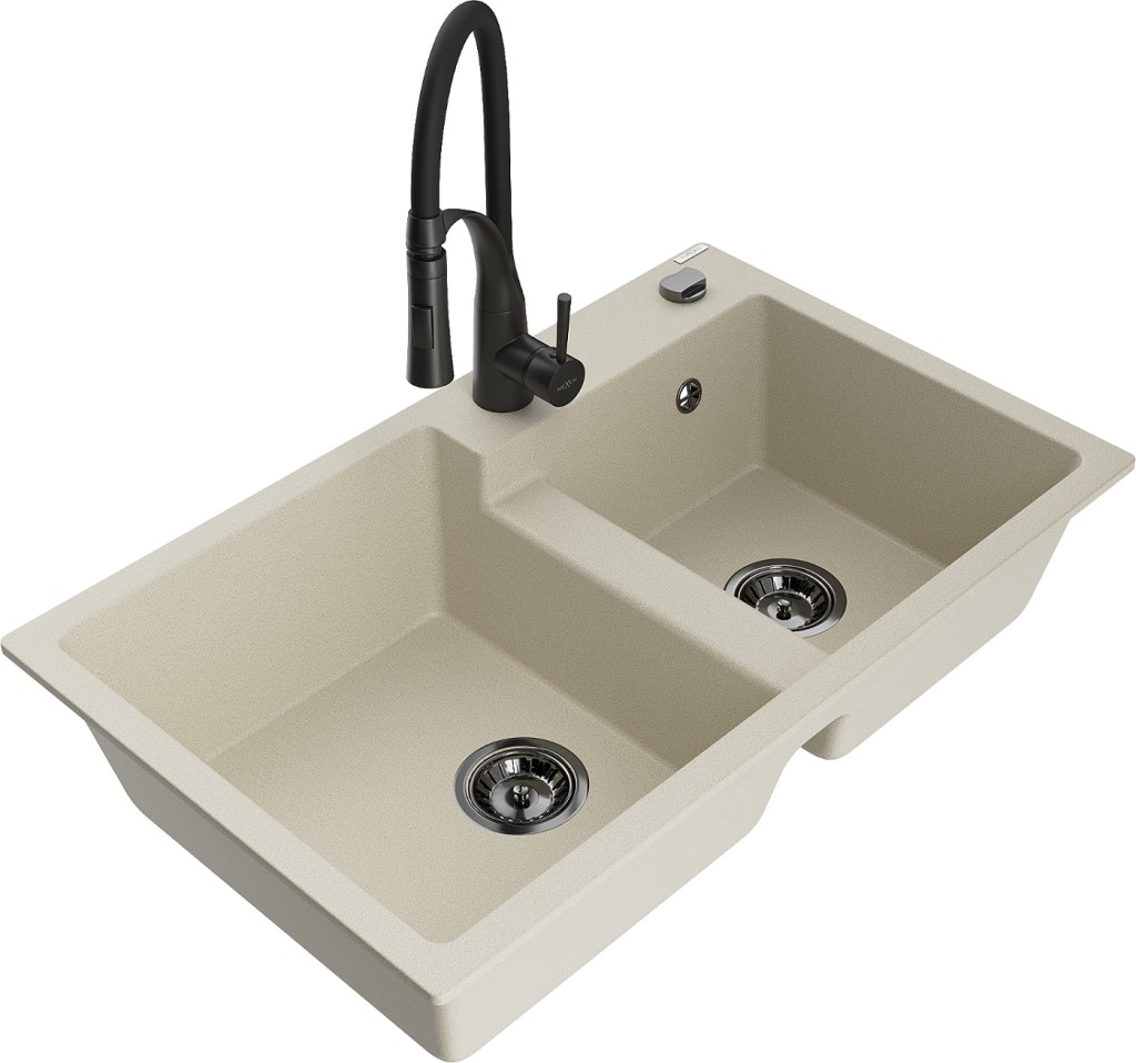 Technické dáta: drez: Rozmer: 800 x 500 x 190 mm Hĺbka komory: 180 mm (väčšia), 180 mm (menšia) Rozmery komory: 440x387 mm (väčšie), 370x303 mm (menšie) Priemer odtoku: ø90 mm Typ: 2-komorový Typ: Zapustené do pracovnej dosky Materiál: žula Farba béžová Povrchová úprava sifónu: čierna Materiál: žula (80% žulové kamenivo, 20% živice) Prepadový otvor: Áno Otvory: (batérie, automatické) 2 Vysoká odolnosť proti poškriabaniu a zmene farby Odolnosť proti tepelným šokom Ľahko čistiteľný povrch Jeden dodatočný vyfrézovaný otvor na samodierovanie ø35 kuchynská batéria: Materiál: mosadz Čierna farba Hlava: Keramická Prevzdušňovač: Áno Typ: Jedna páka Výška batérie: 430 mm Rozsah výtoku: 185 mm Batéria má výsuvný výtok(GT) Ean: 5905315048080