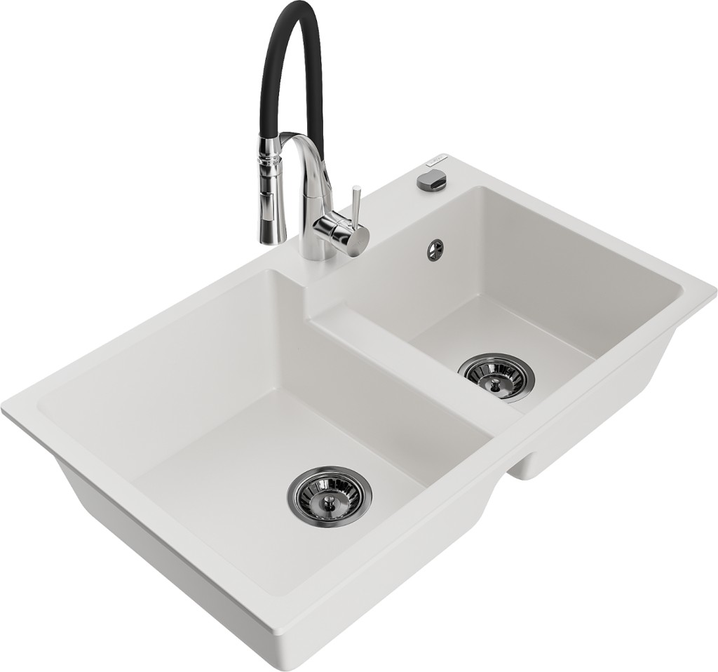 Technické dáta: drez: Rozmer: 800 x 500 x 190 mm Hĺbka komory: 180 mm (väčšia), 180 mm (menšia) Rozmery komory: 440x387 mm (väčšie), 370x303 mm (menšie) Priemer odtoku: ø90 mm Typ: 2-komorový Typ: Zapustené do pracovnej dosky Materiál: žula biela farba Povrchová úprava sifónu: čierna Materiál: žula (80% žulové kamenivo, 20% živice) Prepadový otvor: Áno Otvory: (batérie, automatické) 2 Vysoká odolnosť proti poškriabaniu a zmene farby Odolnosť proti tepelným šokom Ľahko čistiteľný povrch Jeden dodatočný vyfrézovaný otvor na samodierovanie ø35 kuchynská batéria: Materiál: mosadz Farba: chróm/čierna Hlava: Keramická Prevzdušňovač: Áno Typ: Jedna páka Výška batérie: 430 mm Rozsah výtoku: 185 mm Batéria má výsuvný výtok(GT) Ean: 5905315047991