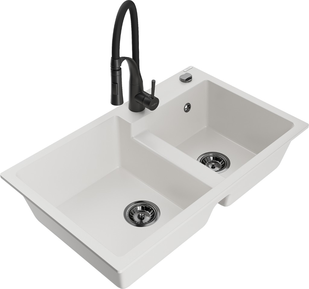 Technické dáta: drez: Rozmer: 800 x 500 x 190 mm Hĺbka komory: 180 mm (väčšia), 180 mm (menšia) Rozmery komory: 440x387 mm (väčšie), 370x303 mm (menšie) Priemer odtoku: ø90 mm Typ: 2-komorový Typ: Zapustené do pracovnej dosky Materiál: žula biela farba Povrchová úprava sifónu: čierna Materiál: žula (80% žulové kamenivo, 20% živice) Prepadový otvor: Áno Otvory: (batérie, automatické) 2 Vysoká odolnosť proti poškriabaniu a zmene farby Odolnosť proti tepelným šokom Ľahko čistiteľný povrch Jeden dodatočný vyfrézovaný otvor na samodierovanie ø35 kuchynská batéria: Materiál: mosadz Čierna farba Hlava: Keramická Prevzdušňovač: Áno Typ: Jedna páka Výška batérie: 430 mm Rozsah výtoku: 185 mm Batéria má výsuvný výtok(GT) Ean: 5905315048028